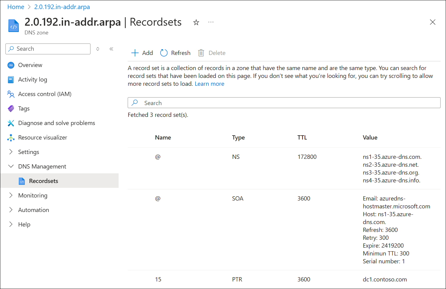 At the top of the reverse DNS zone Overview page, select Record sets and then select +Add.