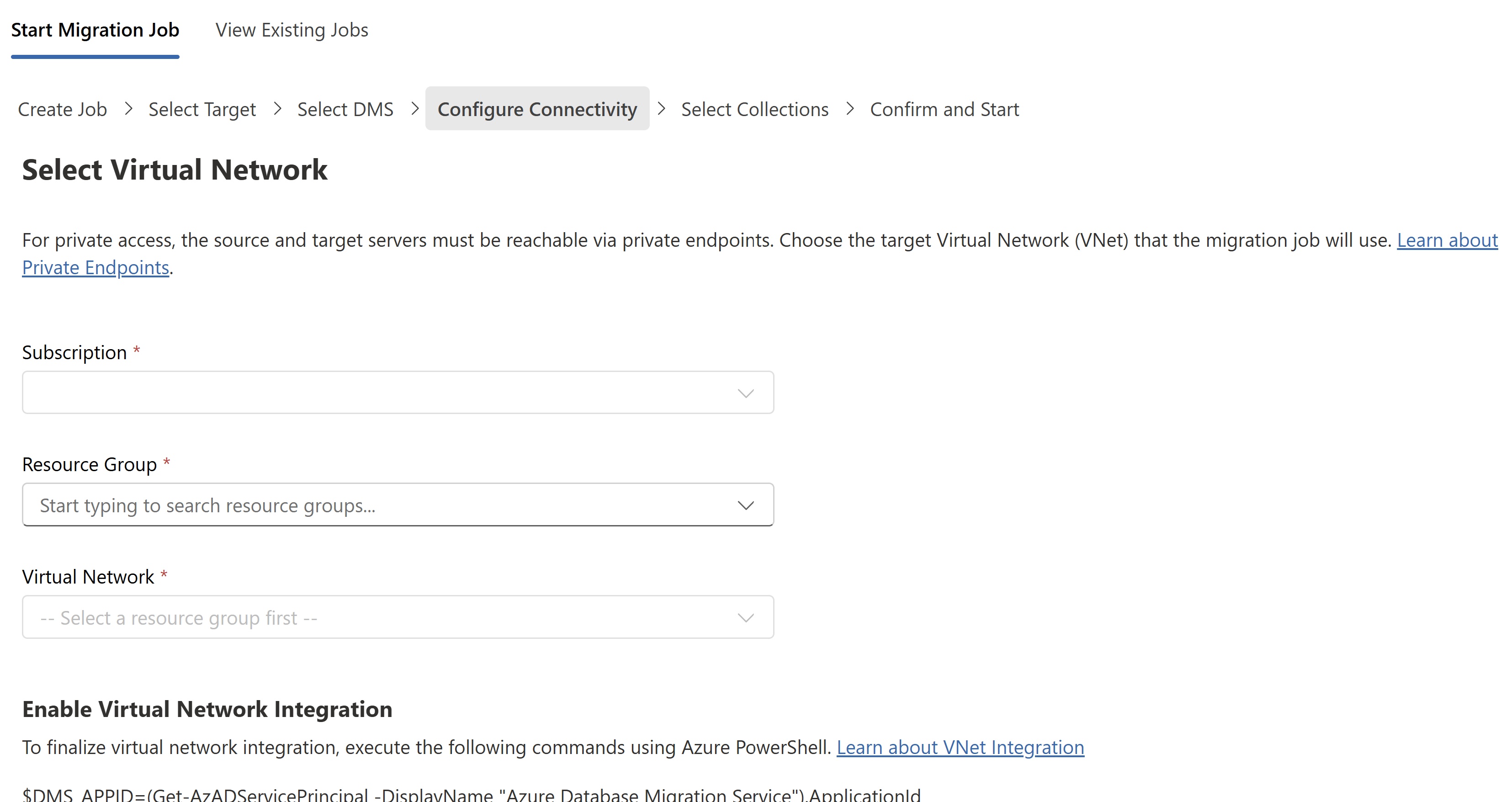 Run the PowerShell script provided on the screen to enable virtual network integration.