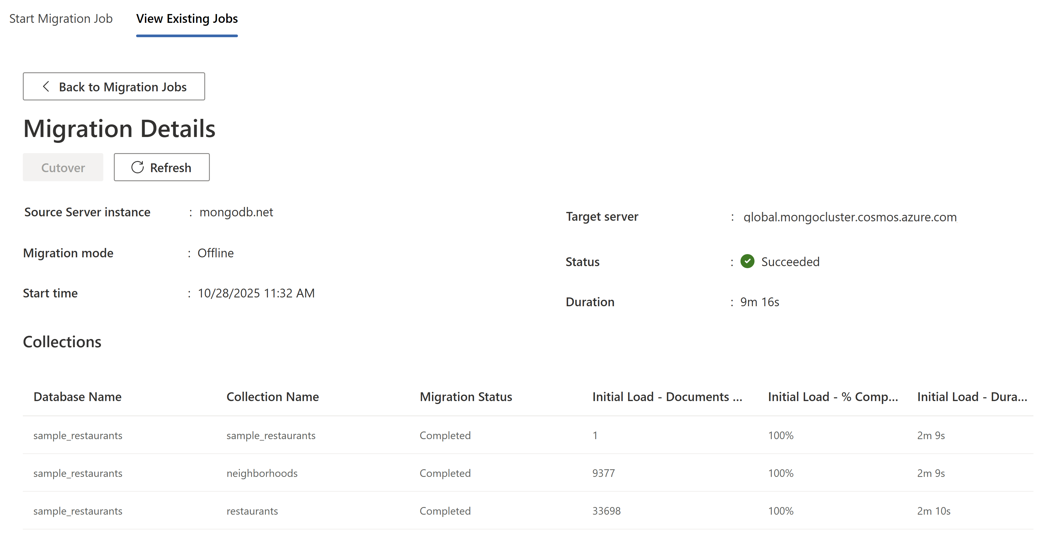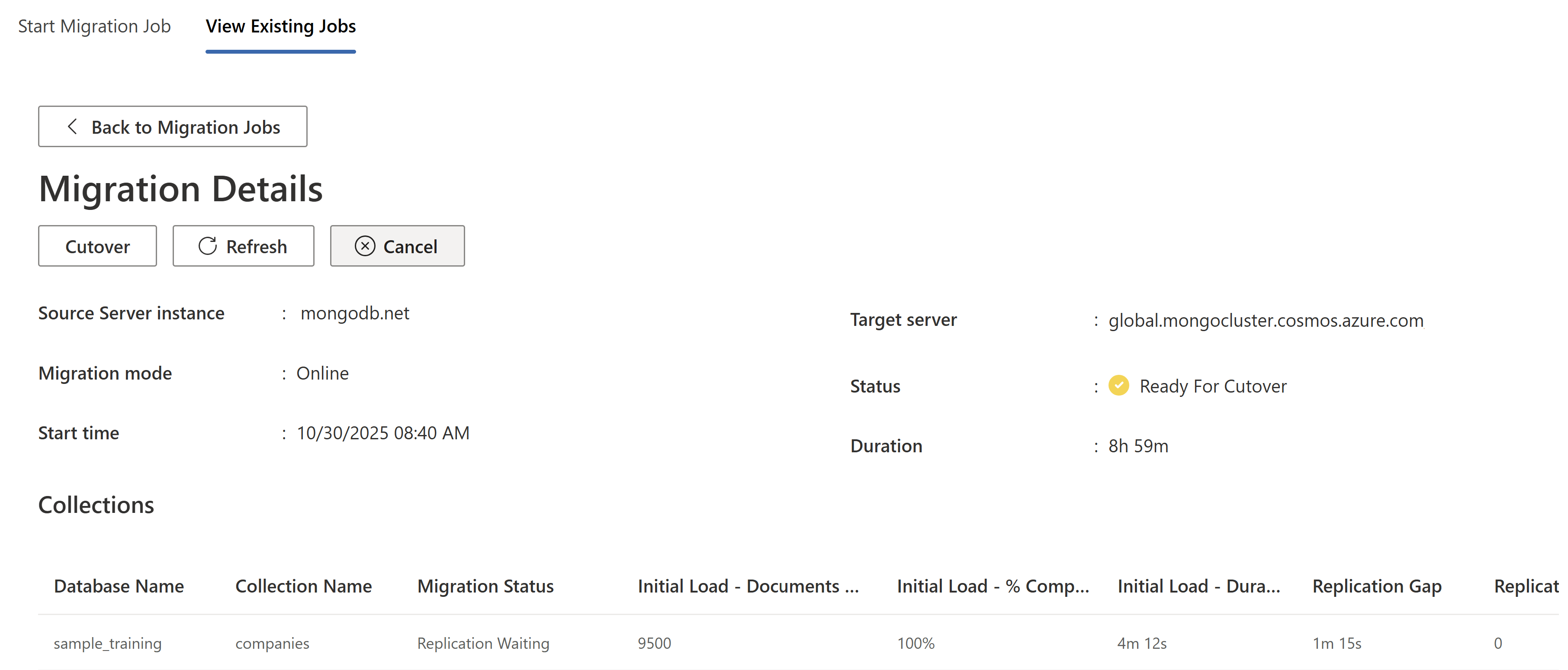 The status is automatically updated at frequent intervals. Offline jobs automatically complete once the selected collection snapshots are copied to target. However, the online migrations need to be manually cut over.