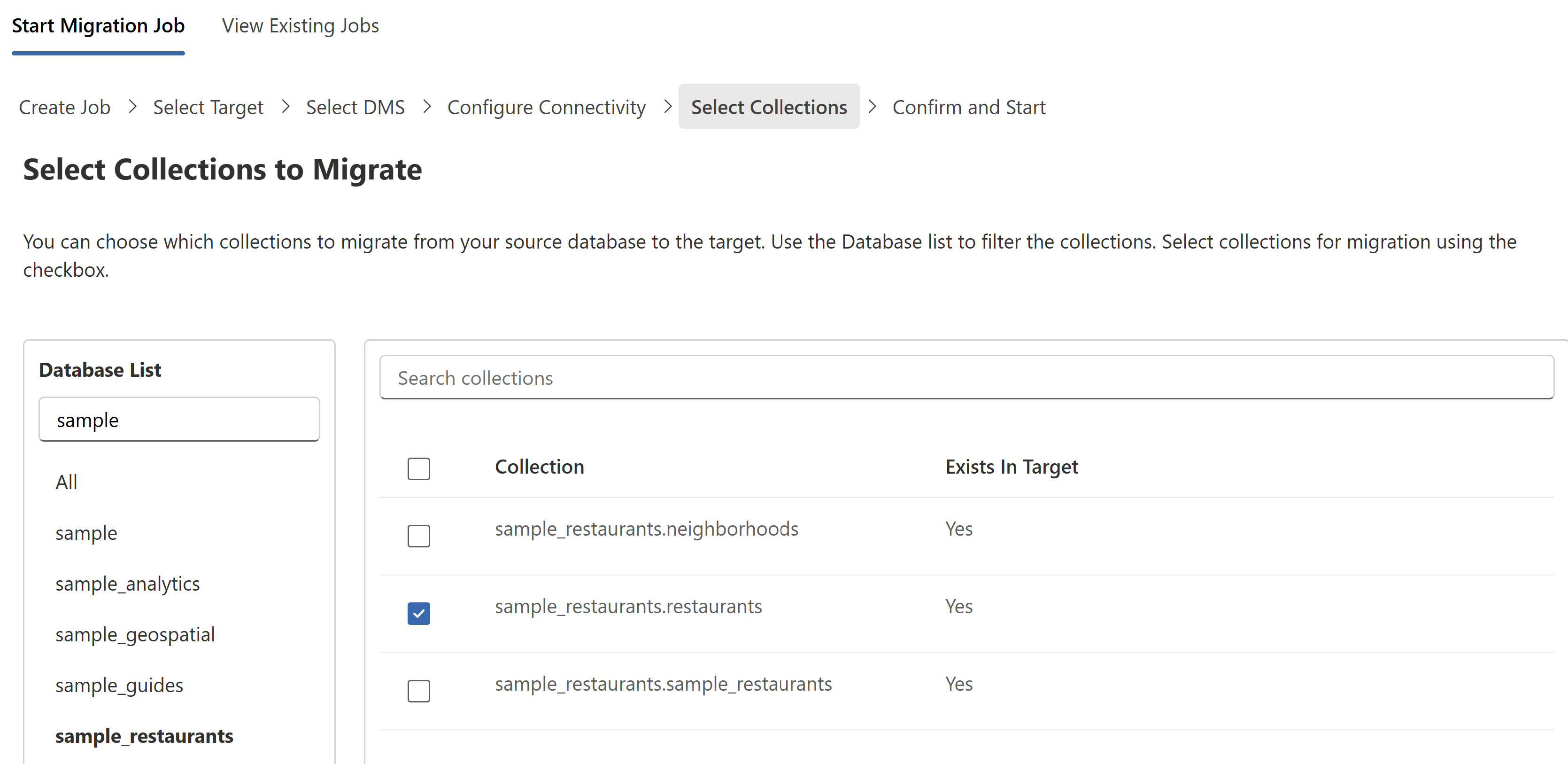 Make sure to select all collections you want to include as the collections list can't be added once the migration job is created.
