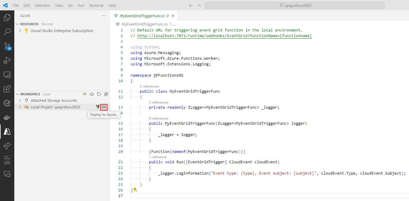 Runmethod. It prints the information by using a logger.[Function(nameof(MyEventGridTriggerFunc))] public void Run([EventGridTrigger] CloudEvent cloudEvent) { _logger.LogInformation("Event type: {type}, Event subject: {subject}", cloudEvent.Type, cloudEvent.Subject); }