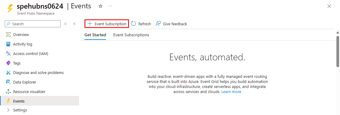 On the Event Hubs Namespace page, select Events, and then select + Event Subscription on the toolbar.