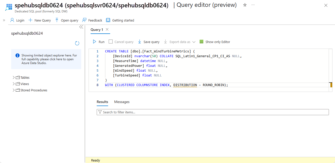 CREATE TABLE [dbo].[Fact_WindTurbineMetrics] ( [DeviceId] nvarchar(50) COLLATE SQL_Latin1_General_CP1_CI_AS NULL, [MeasureTime] datetime NULL, [GeneratedPower] float NULL, [WindSpeed] float NULL, [TurbineSpeed] float NULL ) WITH (CLUSTERED COLUMNSTORE INDEX, DISTRIBUTION = ROUND_ROBIN);Keep this tab or window open so that you can verify that the data is created at the end of the tutorial.