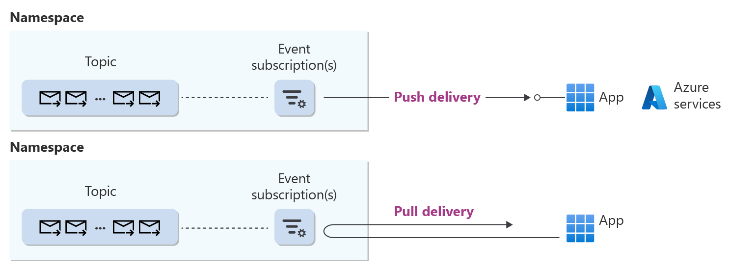 Event Grid supports push and pull event delivery using HTTP. With push delivery, you define a destination in an event subscription, a webhook, or an Azure service, to which Event Grid sends events. With pull delivery, subscriber applications connect to Event Grid to consume events. Pull delivery is supported for topics in an Event Grid namespace.