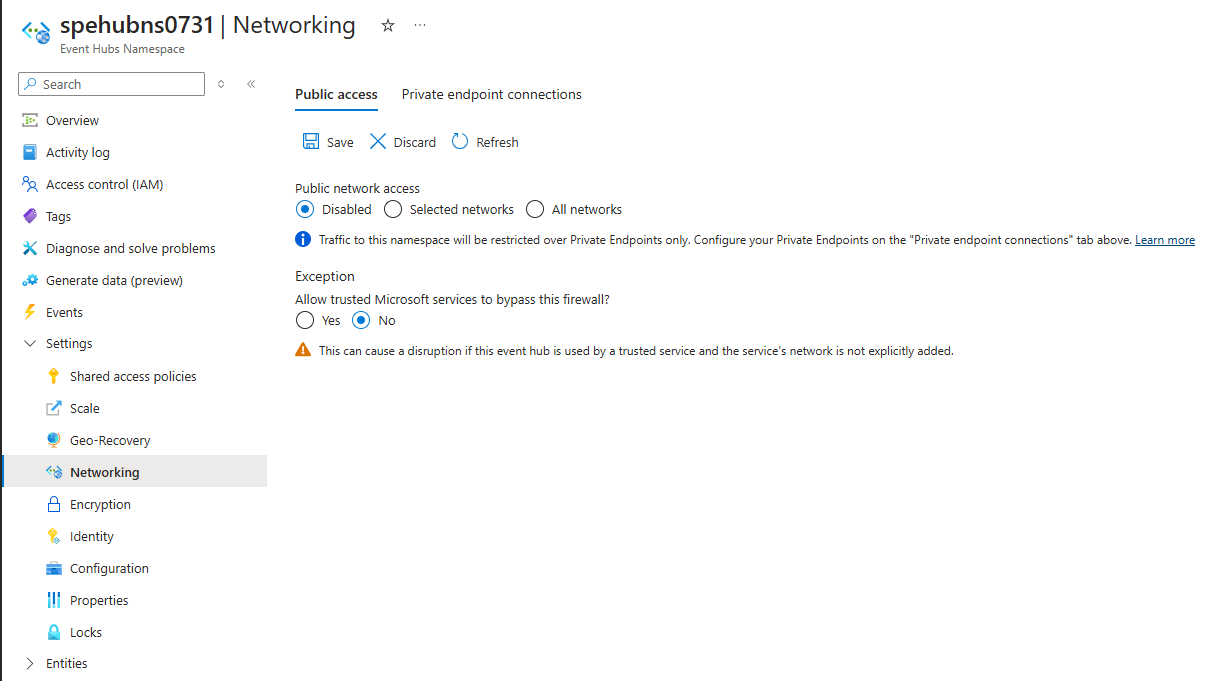 To allow trusted services to access your namespace, switch to the Public Access tab on the Networking page, and select Yes for Allow trusted Microsoft services to bypass this firewall?.