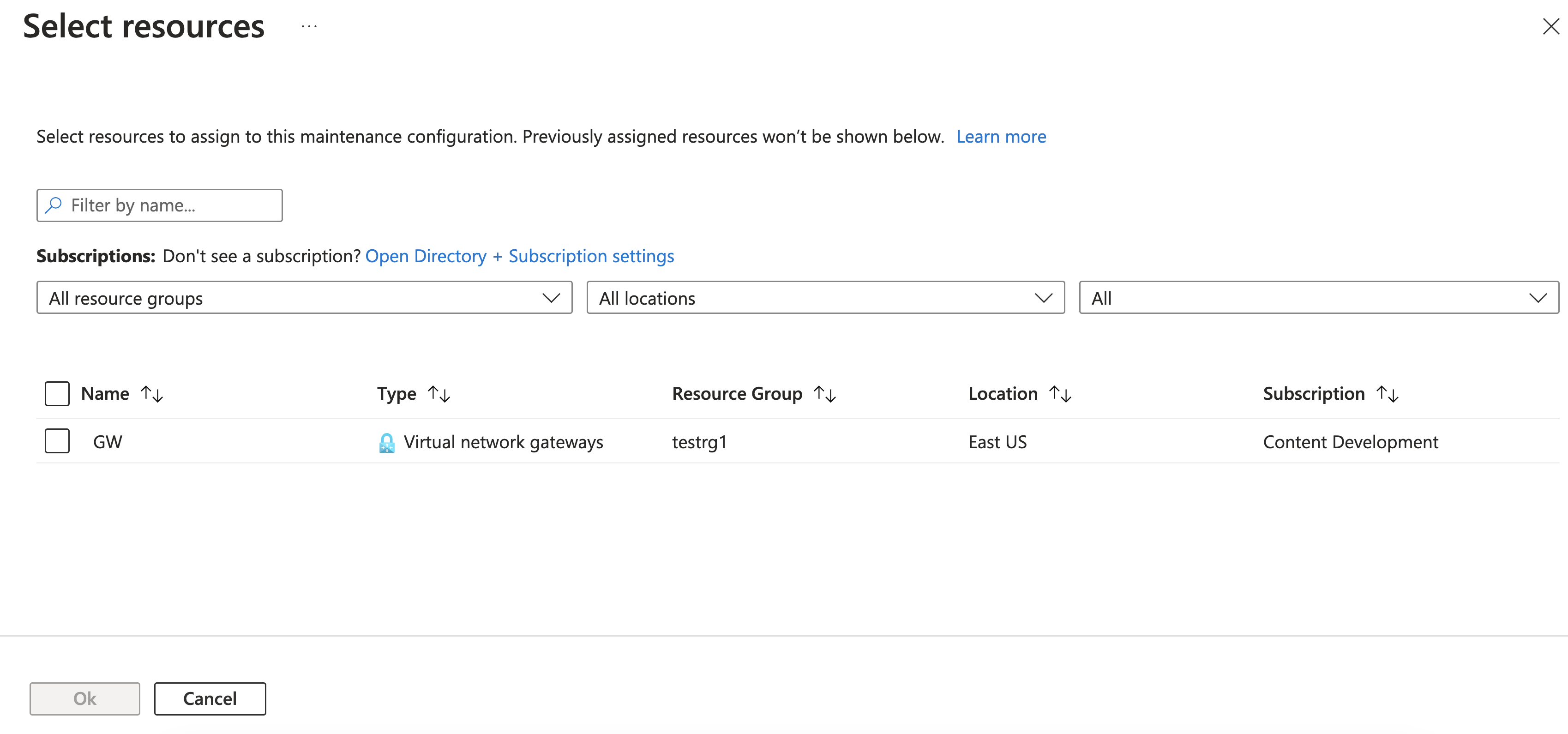 On the Select resources page you should see your resources. If you don't, go back and make sure that you selected the correct region and maintenance scope. Select the resources you want to include in this maintenance configuration, then click OK.