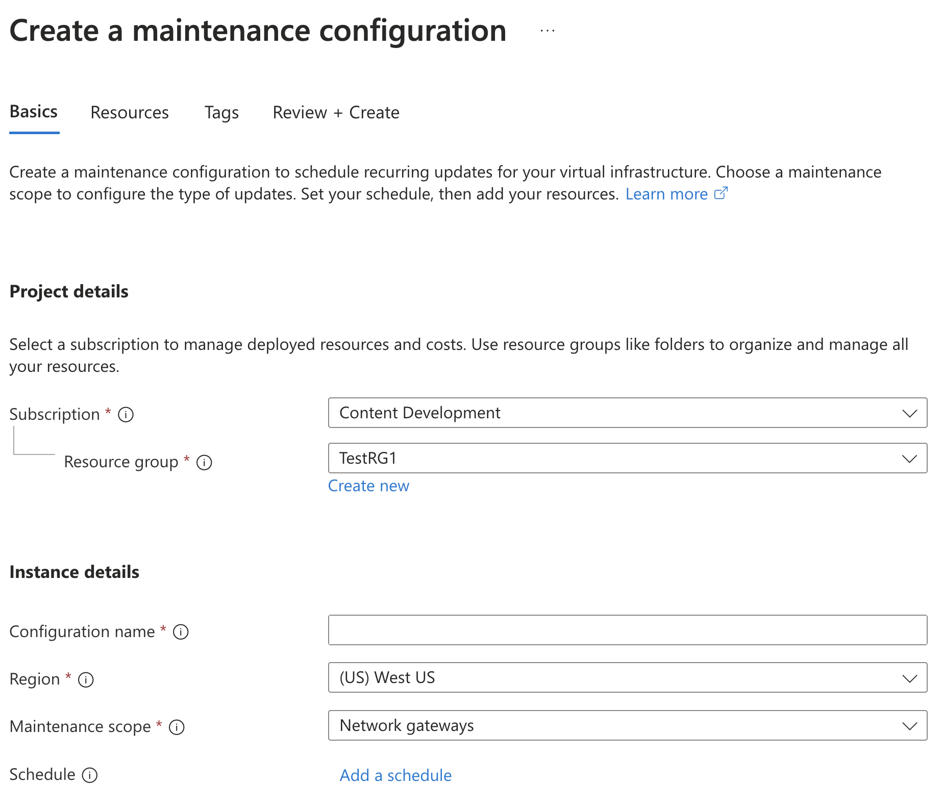 On the Maintenance Configurations page, select + Create to open the create a maintenance configuration page.