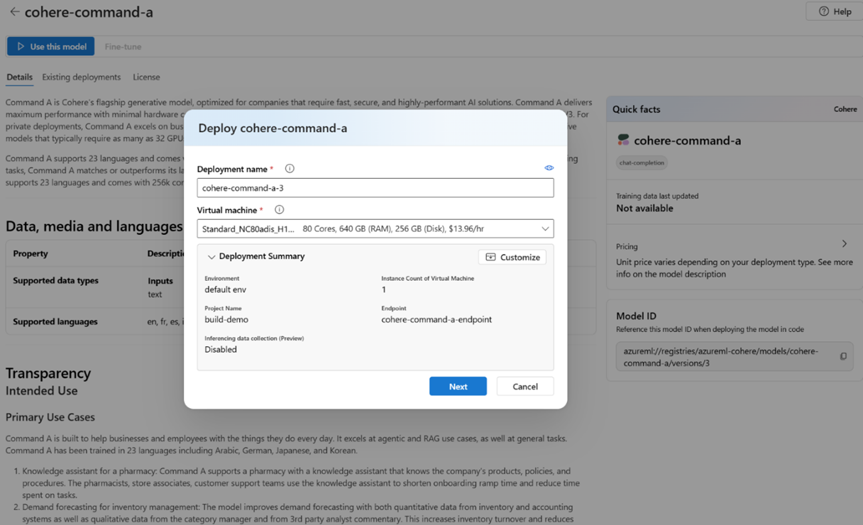 Foundry provides a seamless subscription and transaction experience for protected models as you create and consume your dedicated model deployments at scale. The deployment of protected models on managed compute involves pay-as-you-go billing for the customer in two dimensions:
