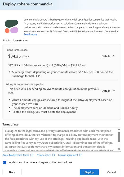 11. Review the pricing breakdown for the deployment, terms of use, and license agreement associated with the model's offer on Azure Marketplace. The pricing breakdown tells you what the aggregated pricing for the deployed model would be, where the surcharge for the model is a function of the number of GPUs in the VM instance that you selected in the previous steps. In addition to the applicable surcharge for the model, Azure compute charges also apply, based on your deployment configuration. If you have existing reservations or Azure savings plan, the invoice for the compute charges honors and reflects the discounted VM pricing.