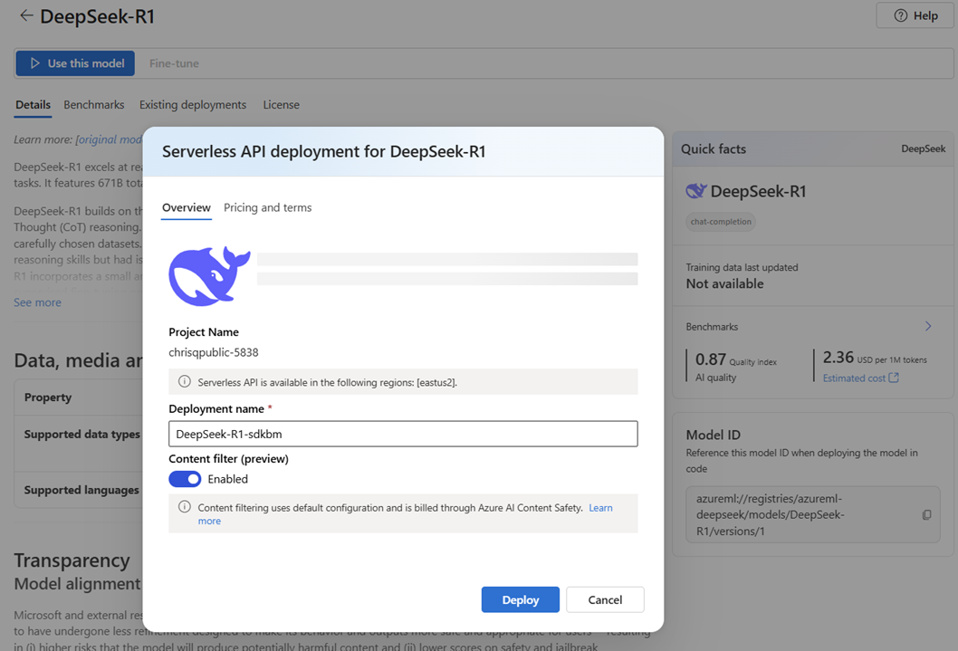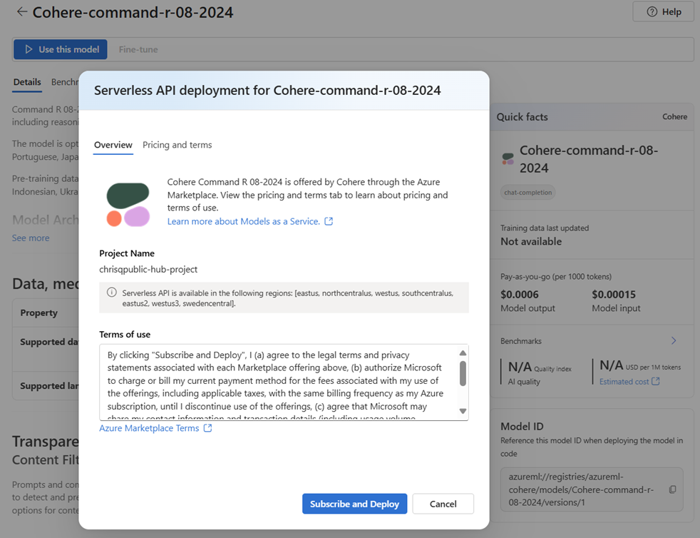 2. Select Use this model to open the Serverless API deployment window where you can view the Pricing and terms tab.