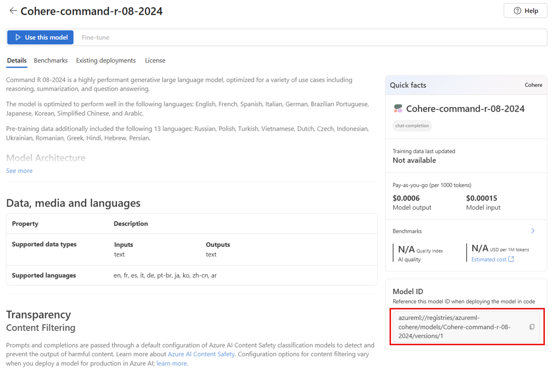 The steps in this section of the article use the DeepSeek-R1 model for illustration. The steps are the same, whether you're using Foundry Models sold directly by Azure or Foundry Models from partners and community. For example, if you choose to deploy the Cohere-command-r-08-2024 model instead, you can replace the model credentials in the code snippets with the credentials for Cohere.