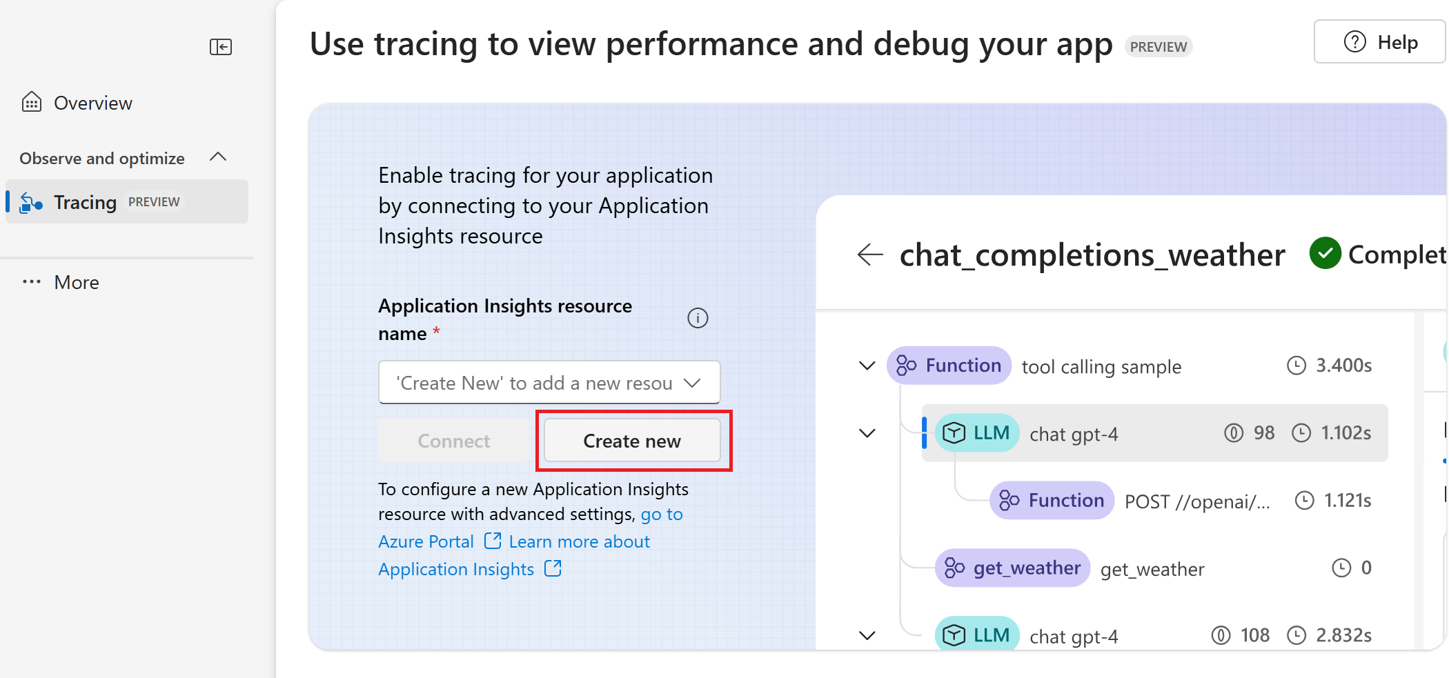 2. Add an Application Insights resource to your project. Navigate to the Tracing tab in the Foundry portal, and create a new resource if you don't already have one.