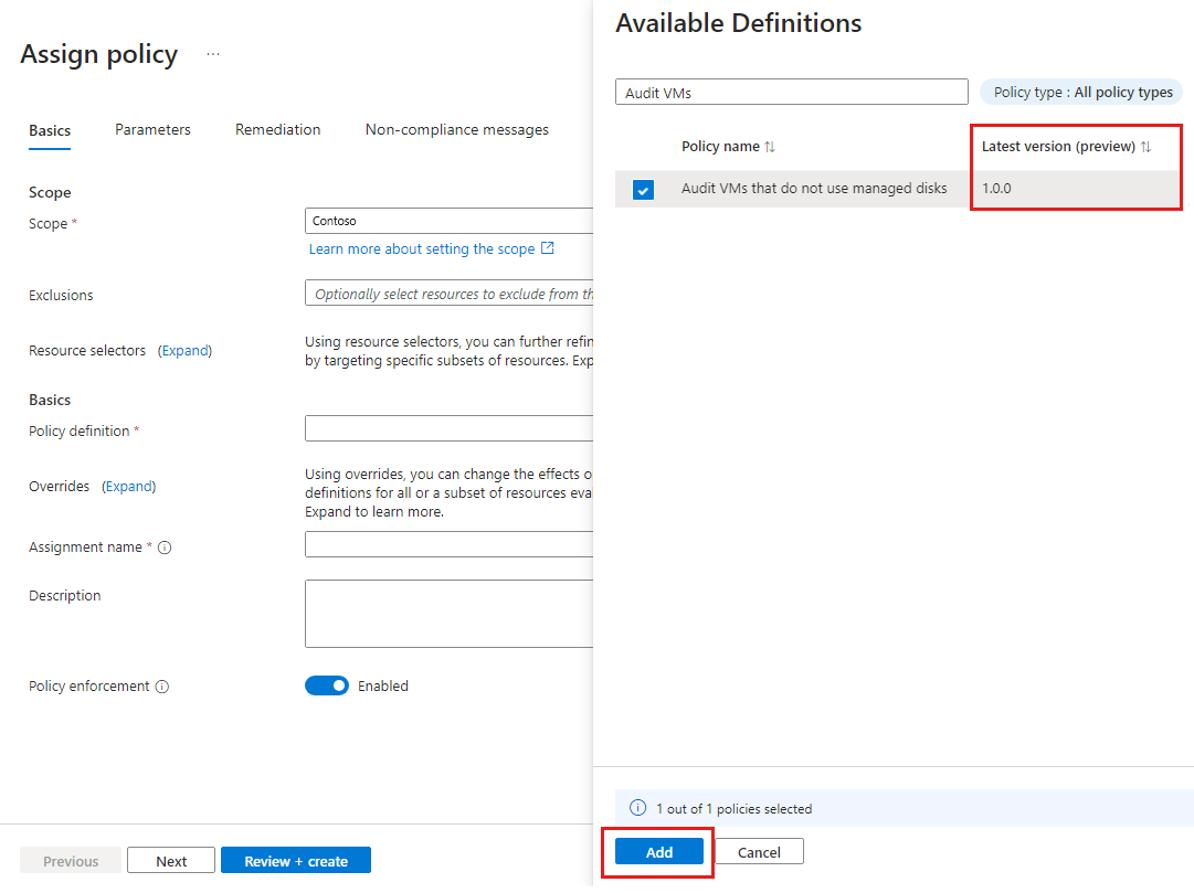 Field Action Scope Use the ellipsis ( ...) and then select a subscription and a resource group. Then choose Select to apply the scope.Exclusions Optional and isn't used in this example. Resource selectors Skip resource selectors for this example. Resource selectors let you refine the resources affected by the policy assignment. Policy definition Select the ellipsis ( ...) to open the list of available definitions.Available Definitions Search the policy definitions list for Audit VMs that do not use managed disks definition, select the policy, and select Add. There's a column that shows the latest version of the definition. Version (preview) Accept the version in format 1.*.*to ingest major, minor, and patch versions.