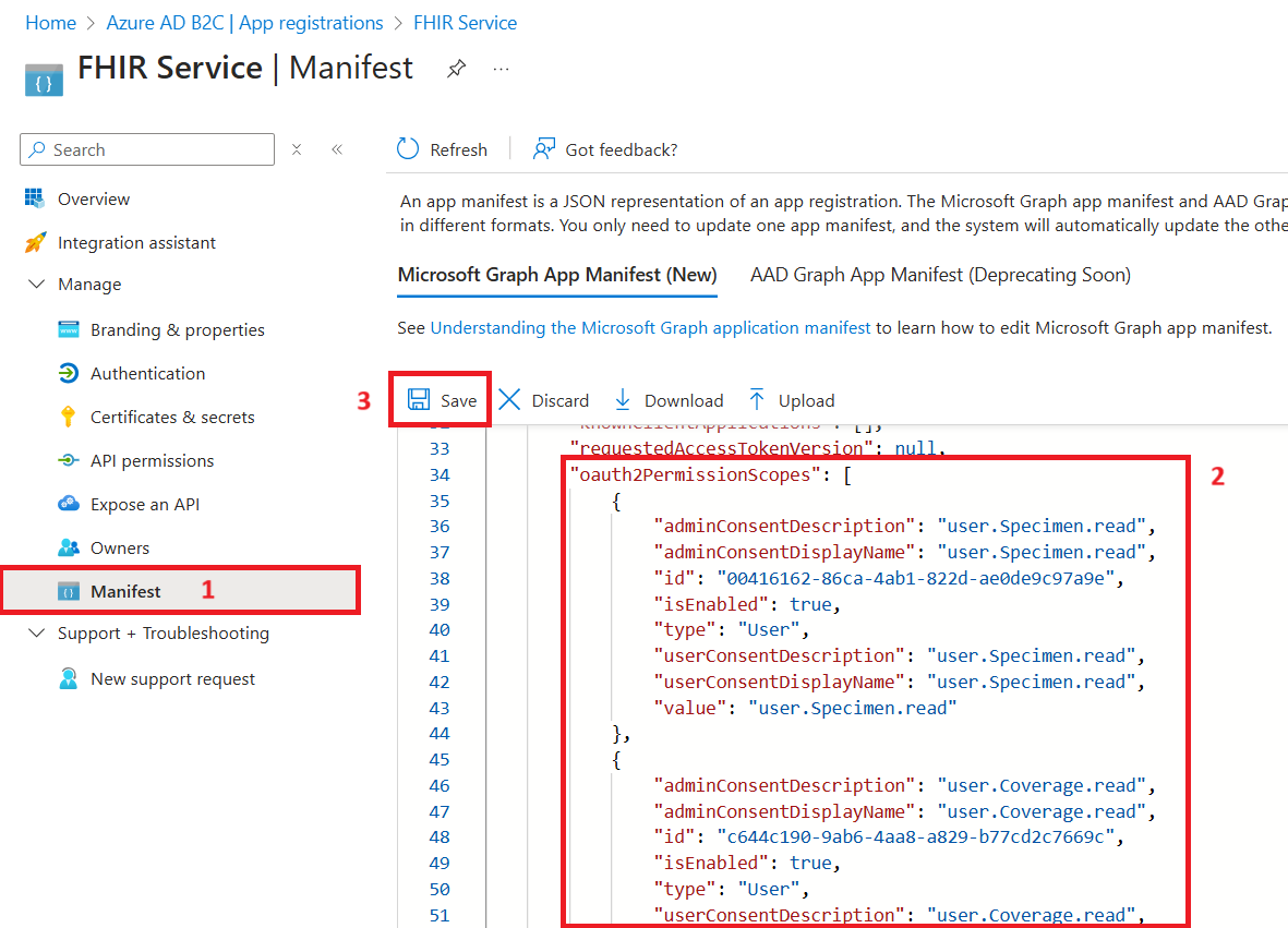 oauth2PermissionScopesarray inMicrosoft Graph App Manifest (New)tab. Replace the array with one or more values in the oauth2Permissions.json file. Copy the entire array or individual permissions.If you add a permission to the list, any user in the B2C tenant can obtain an access token with the API permission. If a level of access isn't appropriate for a user within the B2C tenant, don't add it to the array because there isn't a way to limit permissions to a subset of users.