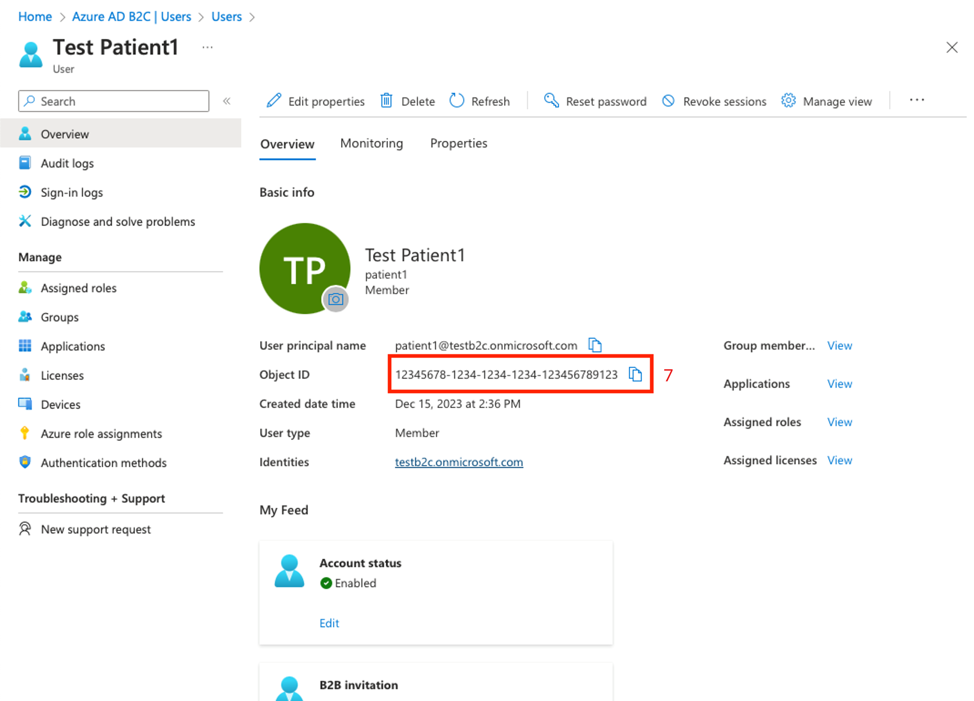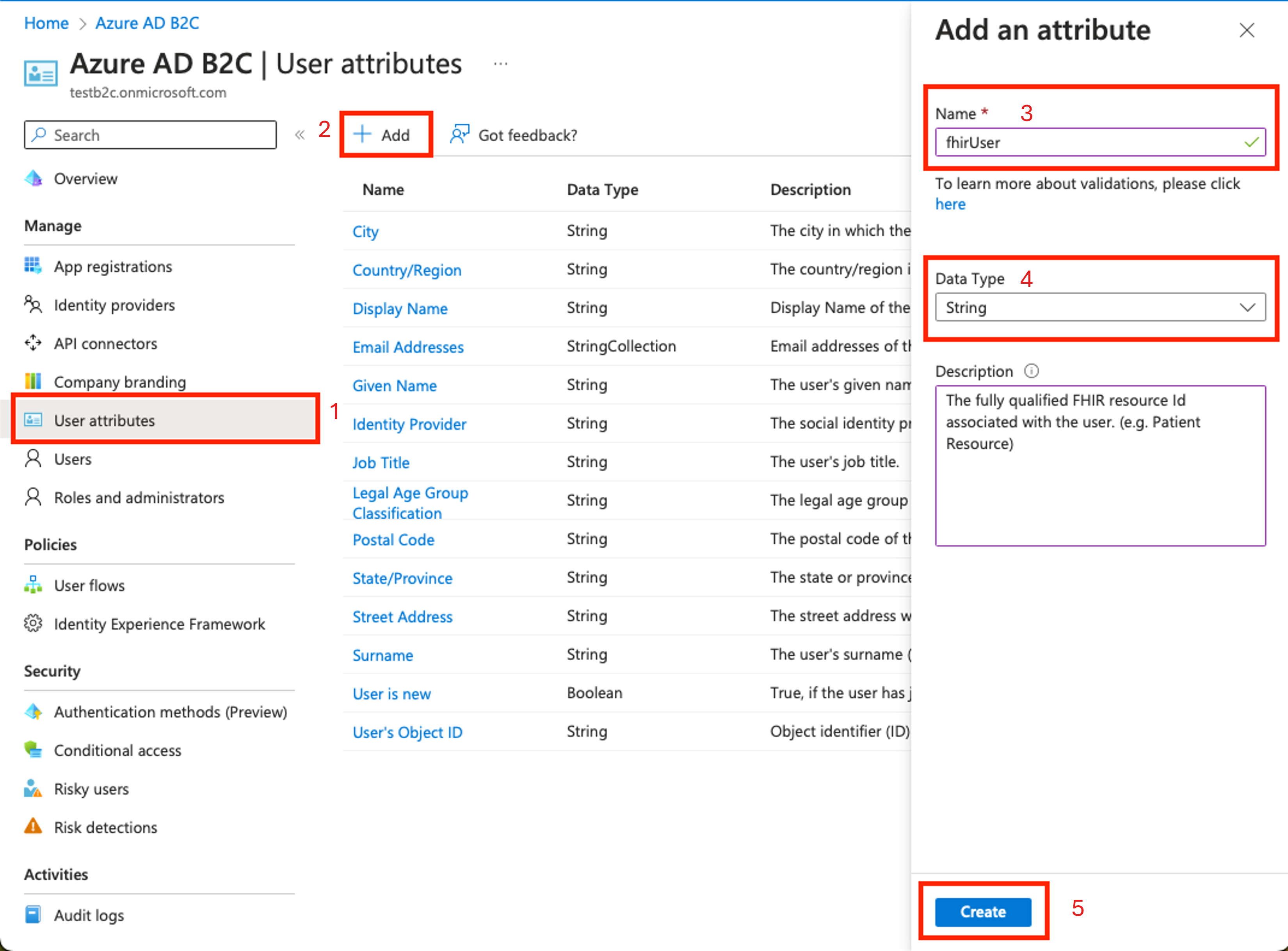 Create an explicit link between the test user in the B2C tenant and the resource in the FHIR service. Create the link by using Extension Attributes in Microsoft Graph. For more information, see Define custom attributes in Azure Active Directory B2C.