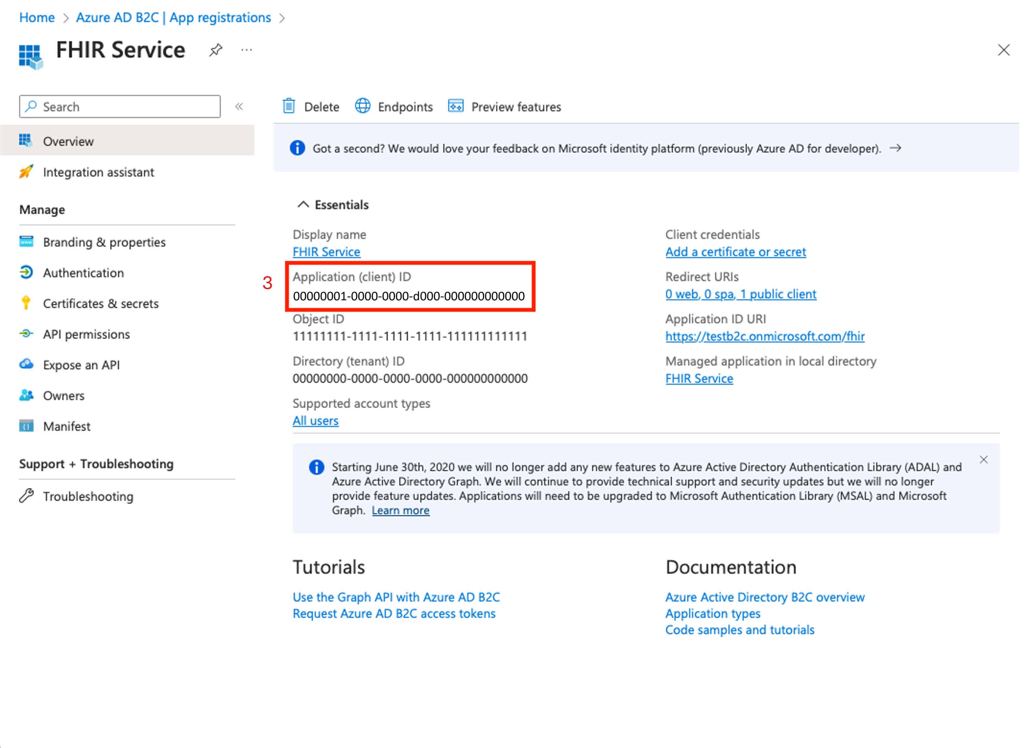 Use the authority and client ID (or application ID) parameters to configure the FHIR service to use an Azure AD B2C tenant as an identity provider.