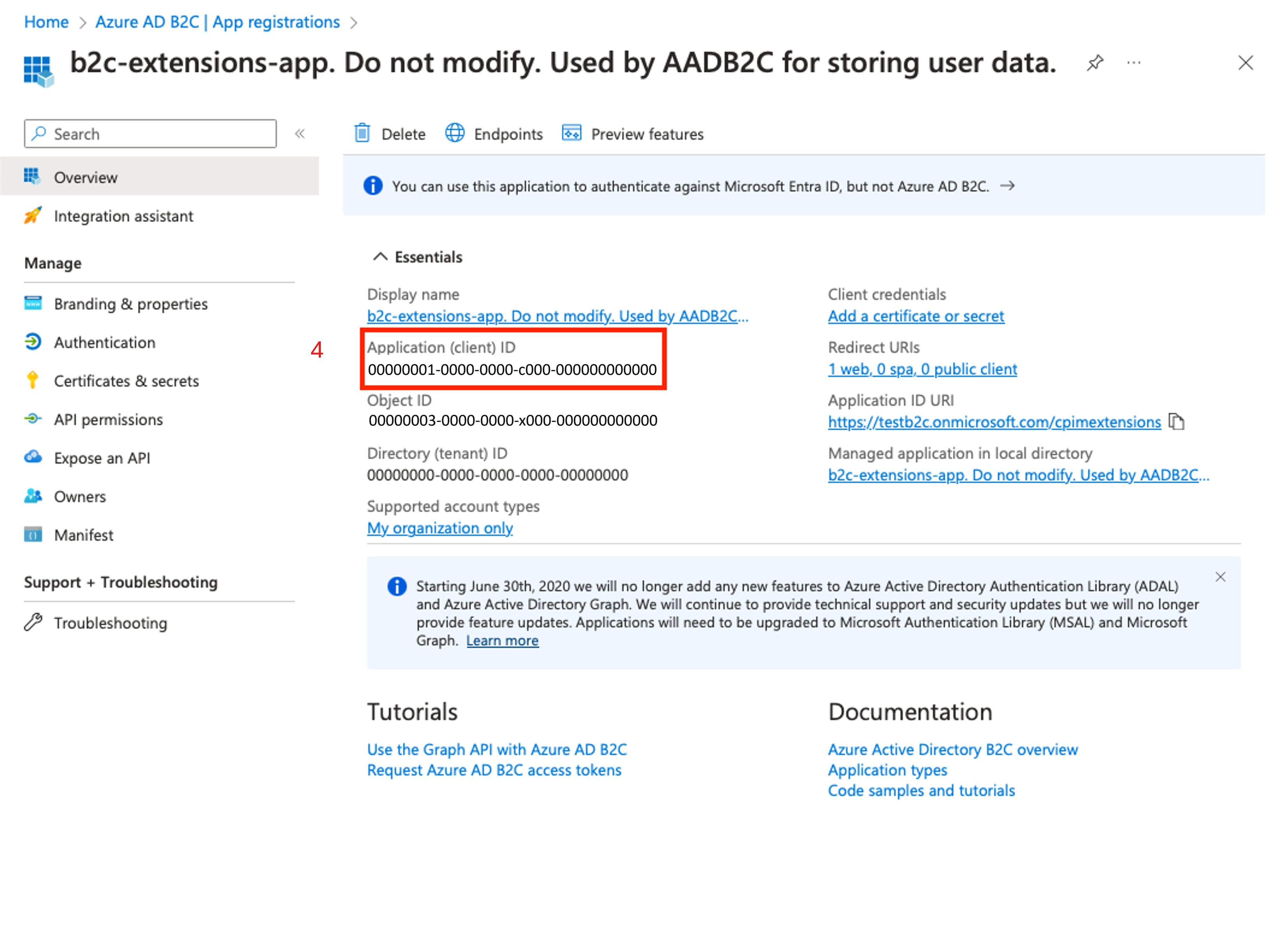 .well-known/openid-configurationendpoint. Enter the string into a browser to confirm it navigates to the OpenId Configuration JSON file. If the OpenId Configuration JSON fails to load, make sure the B2C tenant name and user flow name are correct.https://<YOUR_B2C_TENANT_NAME>.b2clogin.com/<YOUR_B2C_TENANT_NAME>.onmicrosoft.com/<YOUR_USER_FLOW_NAME>/v2.0/.well-known/openid-configurationRetrieve the client ID from the resource application overview page.
