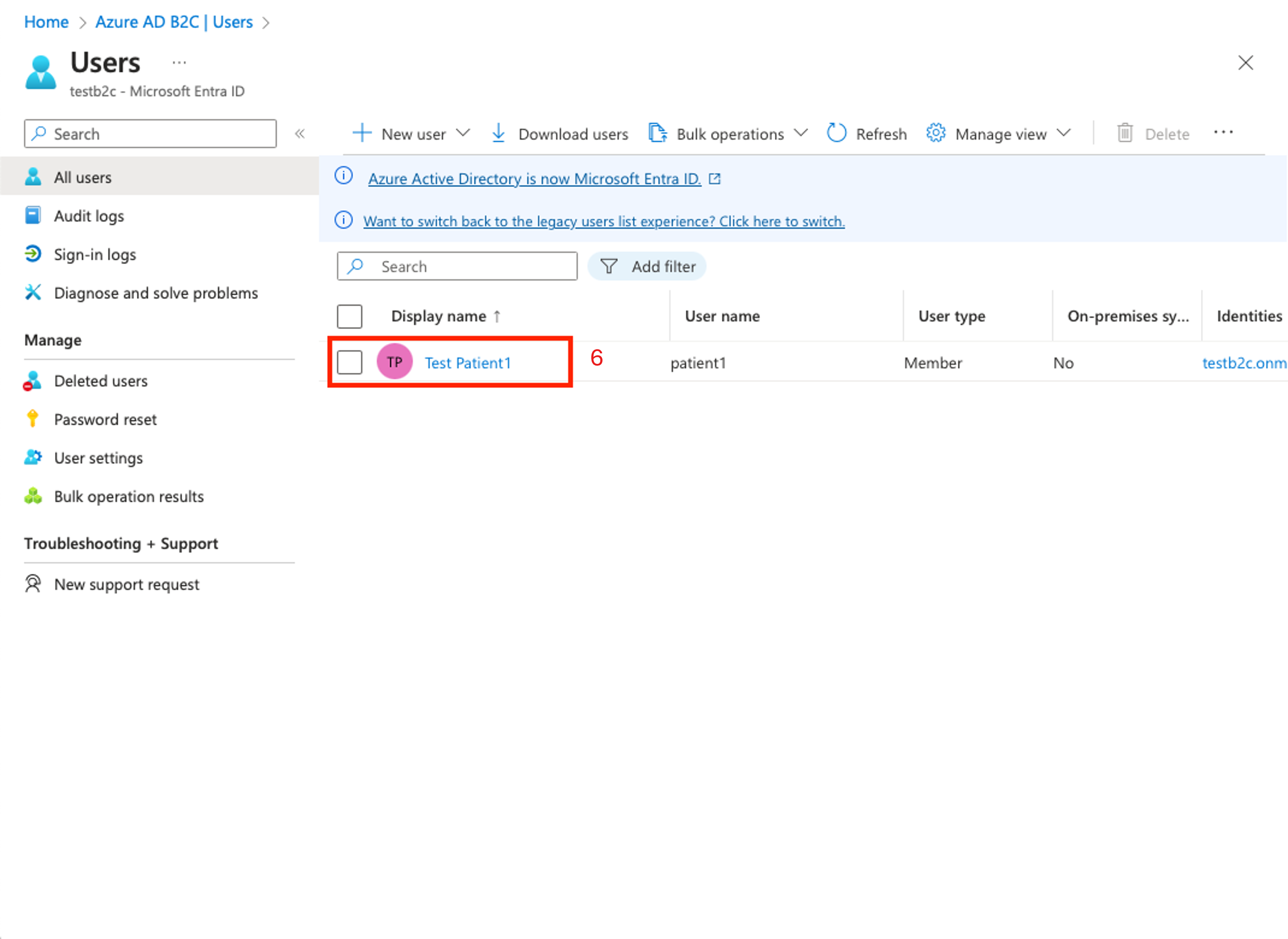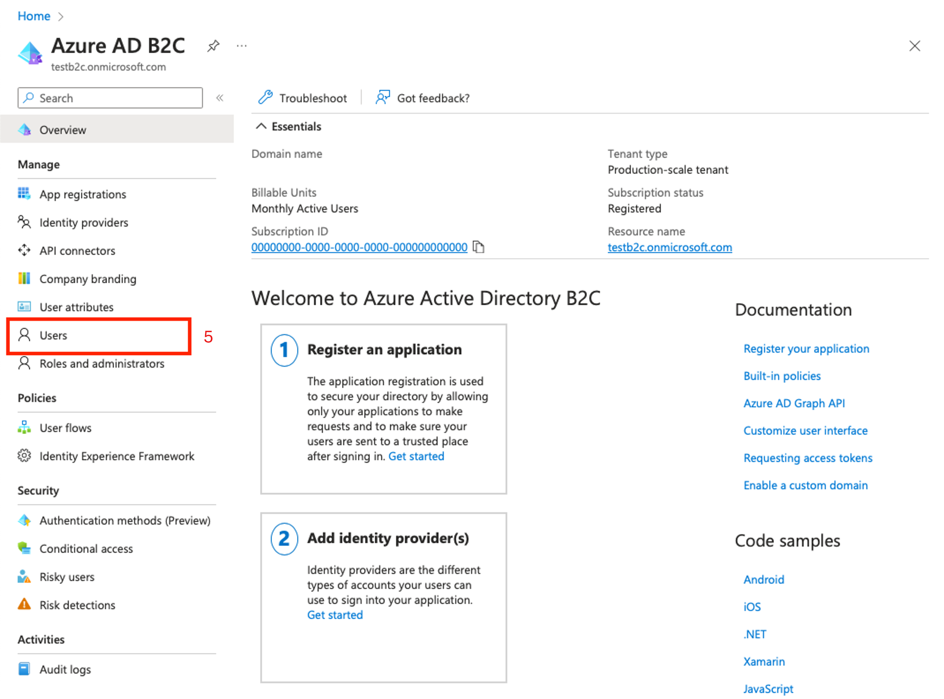 Navigate back to the B2C tenant home page, on the left pane select Users.