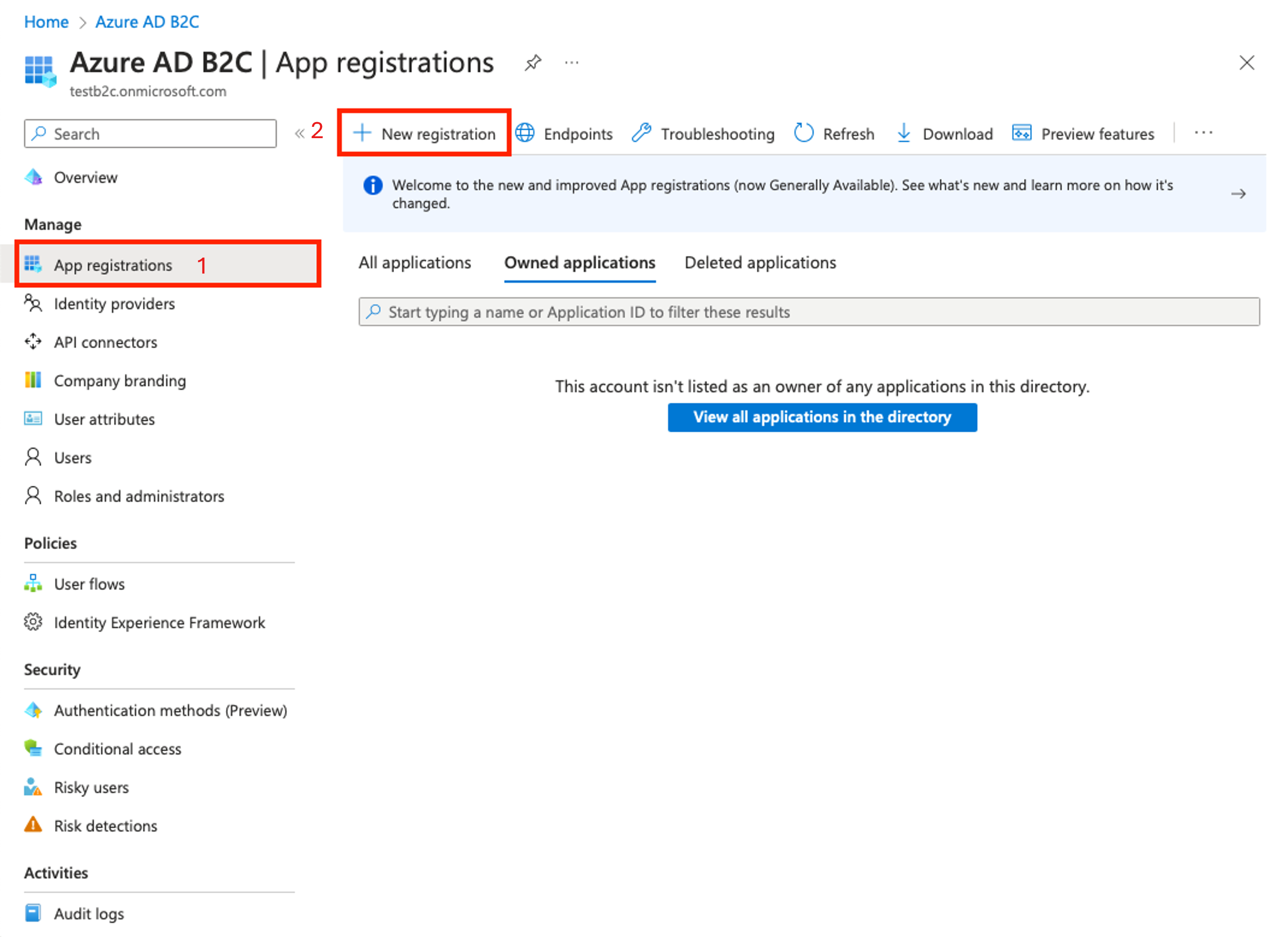 Go to the B2C tenant. On the left pane, choose App registrations.