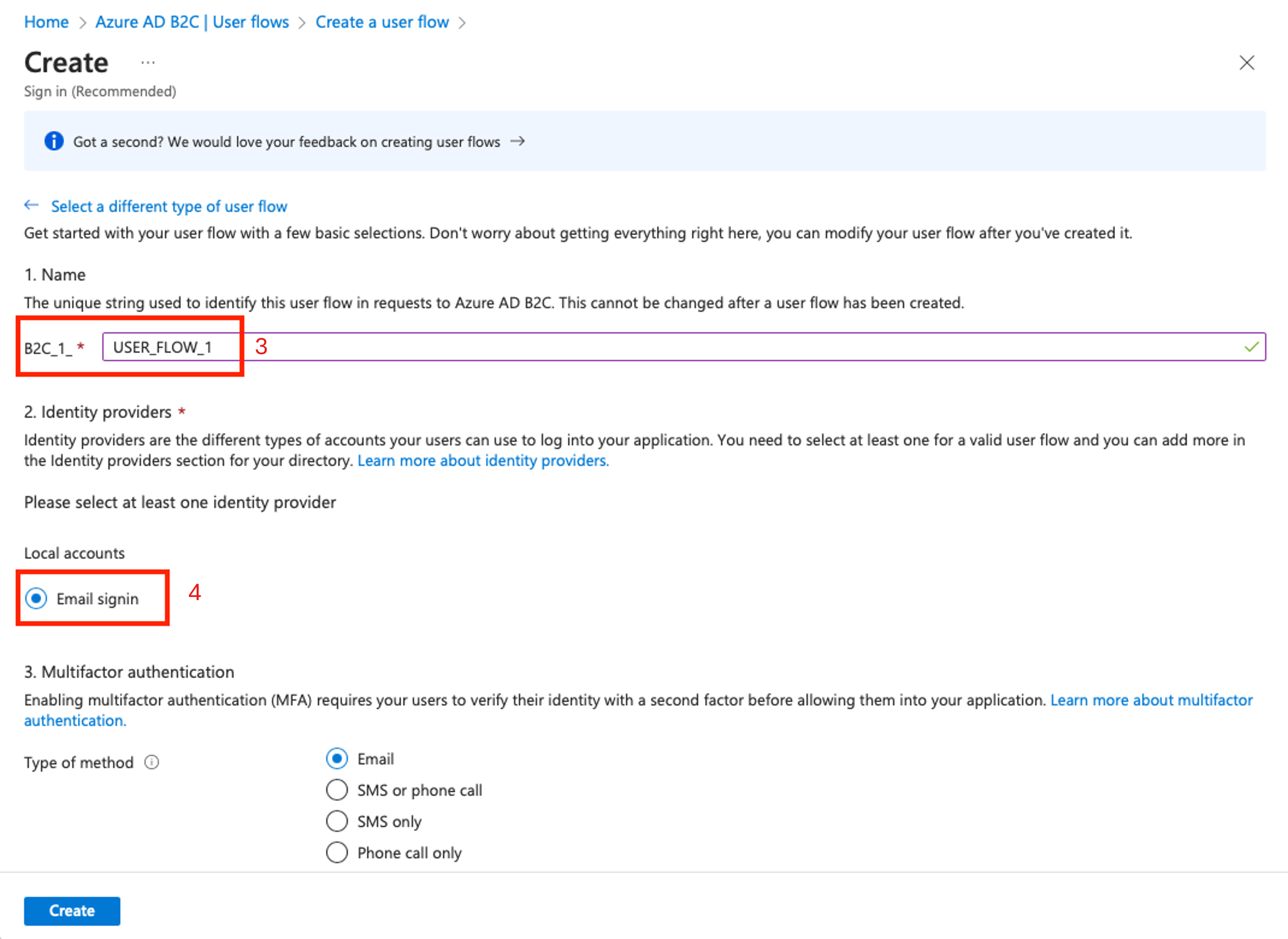 Give the user flow a name unique to the B2C tenant. The name doesn't have to be globally unique. In this example, the name of the user flow is USER_FLOW_1. Make note of the name.