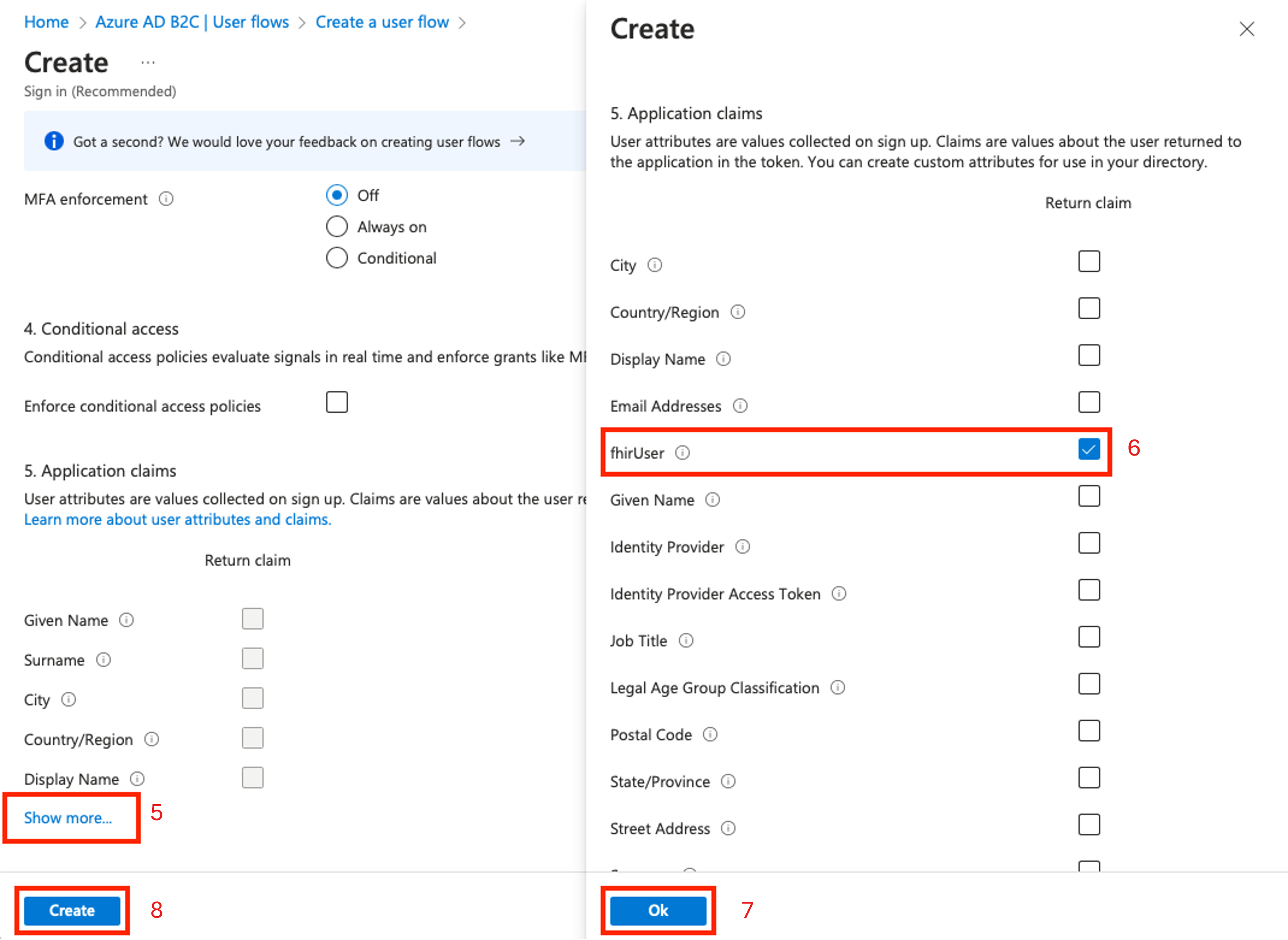 User flows define the sequence of steps users must follow to sign in. In this example, a user flow is defined so that when a user signs in and the access token provided includes the fhirUser claim. For more information, see Create user flows and custom policies in Azure Active Directory B2C.