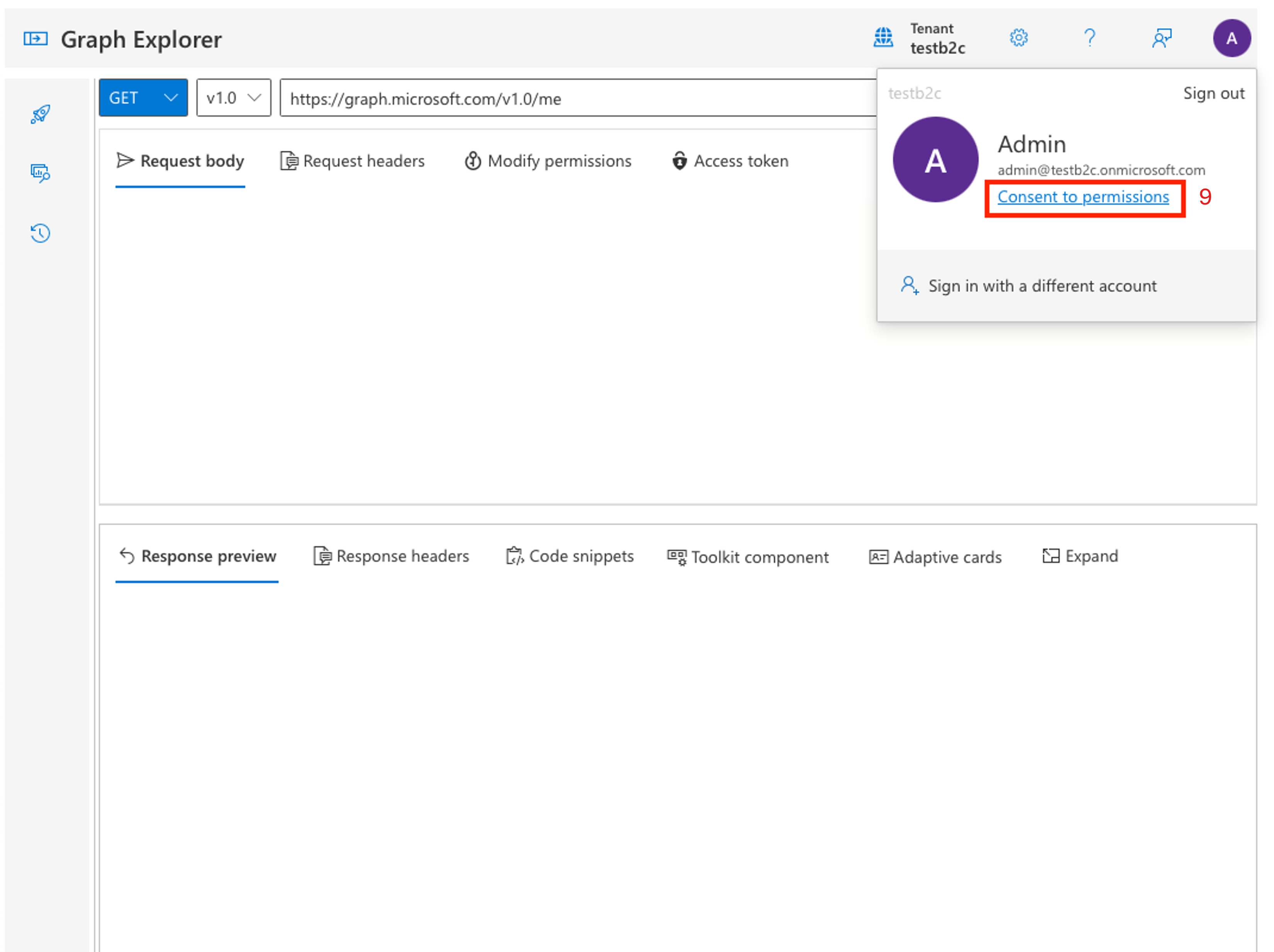 Open Microsoft Graph Explorer. Sign in with a user assigned to the Global Administrator role for the B2C tenant. (It's a good idea to create a new admin user in the B2C tenant to manage users in the tenant.)
