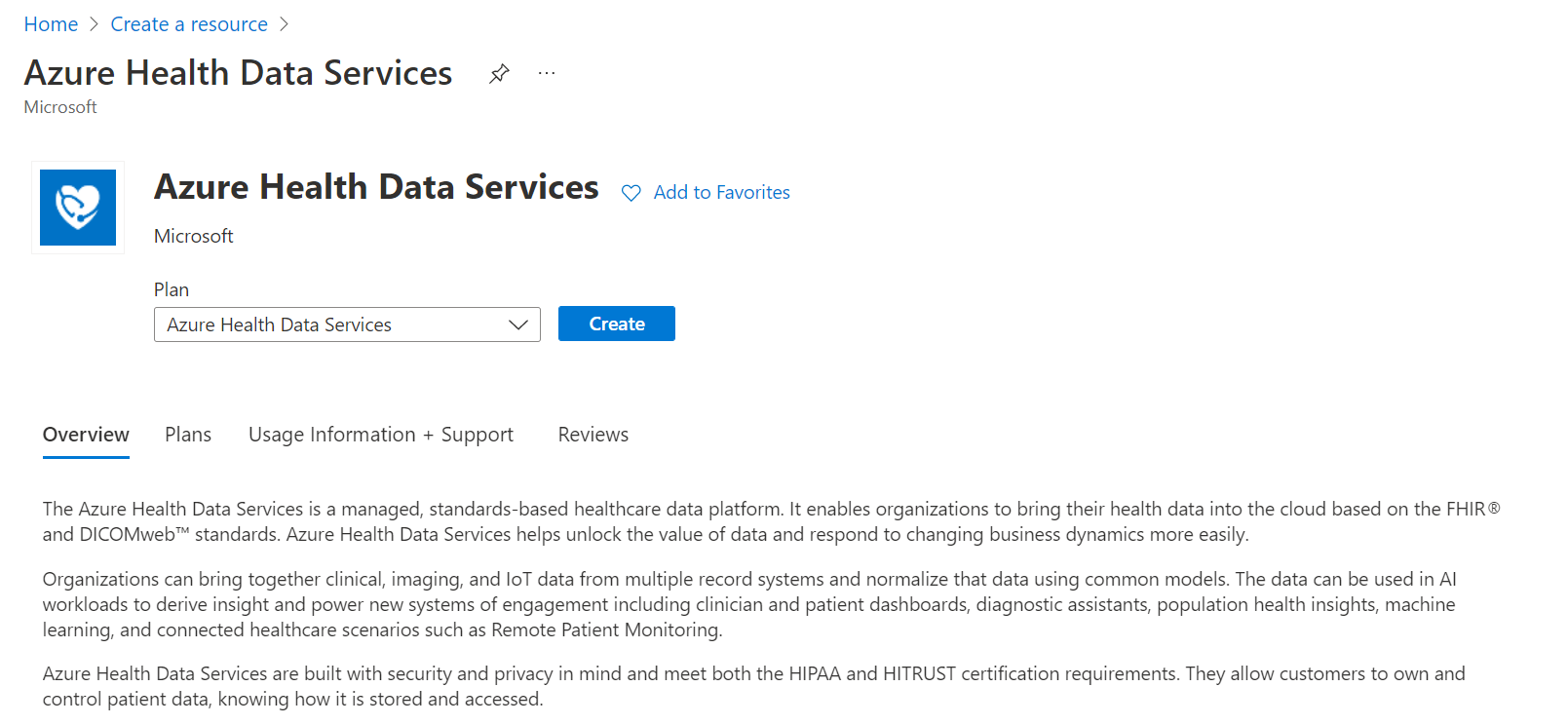 To use Azure Health Data Services, you need to create a resource in the Azure portal. Enter Azure Health Data Services in the Search services and marketplace box. Resource groups function as organizational units that group related services and instances.