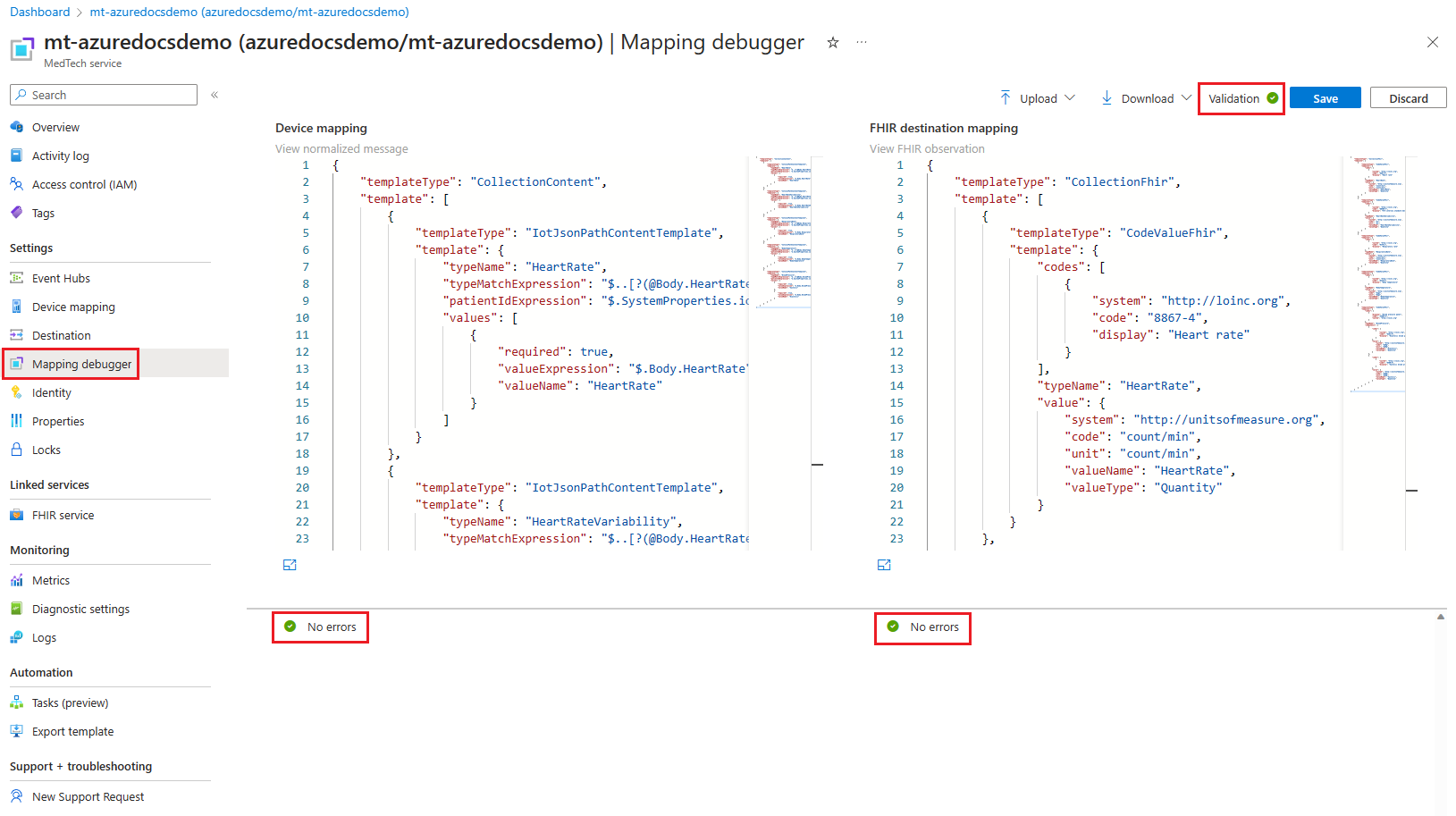 3. We use the suggestions provided by the Mapping debugger, and the error warnings are now fixed. We're ready to select Save to commit our updated device and FHIR destination mappings to the MedTech service.