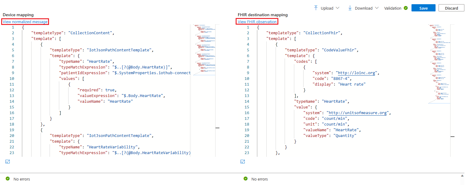 • FHIR destination mapping: Can be edited and saved (optional) to the MedTech service.