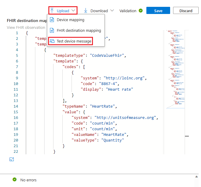 3. Copy/paste or type the test device message into the Upload test device message box. The Validation box can still be red if the either of the mappings has an error/warning. As long as No errors is green, the test device message is valid with the provided device and FHIR destination mappings.