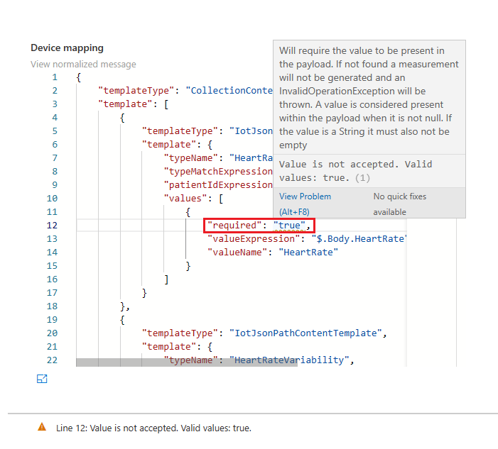 1. If there are errors with the device or FHIR destination mappings, the Mapping debugger displays the issues. In this example, we can see that there are error warnings at Line 12 in the Device mapping and at Line 20 in the FHIR destination mapping.