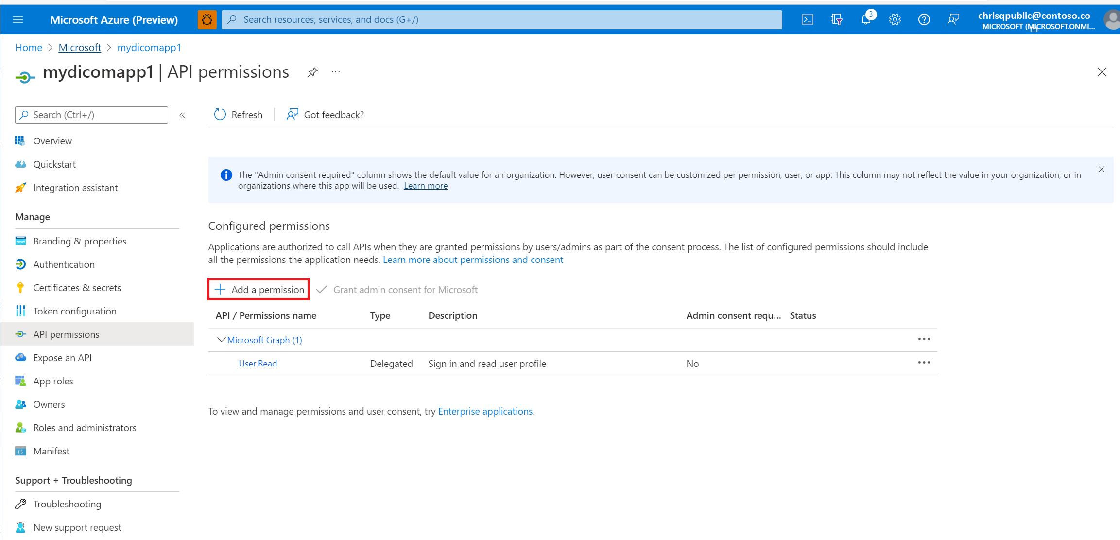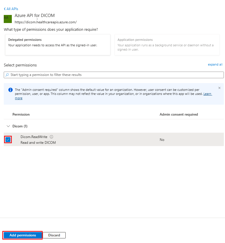If you're using Azure Health Data Services, you'll add a permission to the DICOM service by searching for Azure API for DICOM under APIs my organization uses.