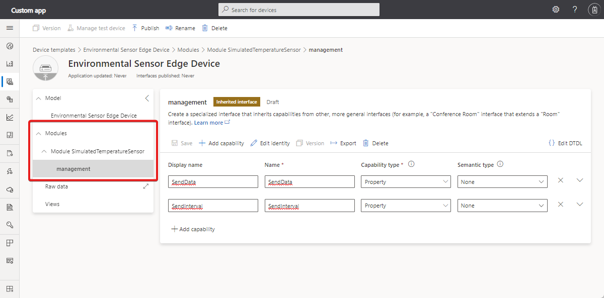 In IoT Central, a module refers to an IoT Edge module running on a connected IoT Edge device. A module can have a simple model such as the thermostat that doesn't use components. A module can also use components to organize a more complex set of capabilities. The following screenshot shows an example of a device template that uses modules. The environmental sensor device has a module called SimulatedTemperatureSensor and an inherited interface called management: