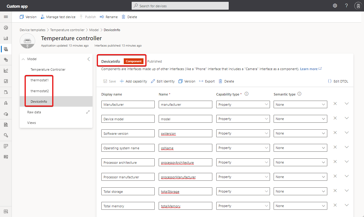 The following screenshot shows a temperature controller device template that uses components. The temperature controller has two thermostat components and a device information component:
