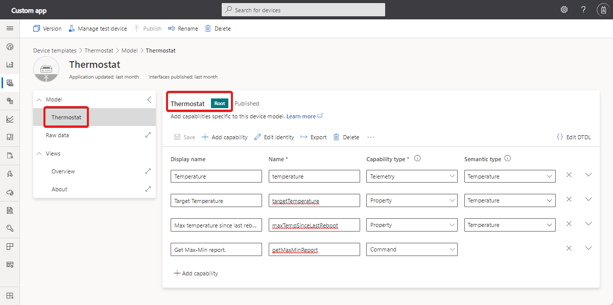 Not all device templates use components. The following screenshot shows the device template for a simple thermostat where all the capabilities are defined in a single interface called the Root component: