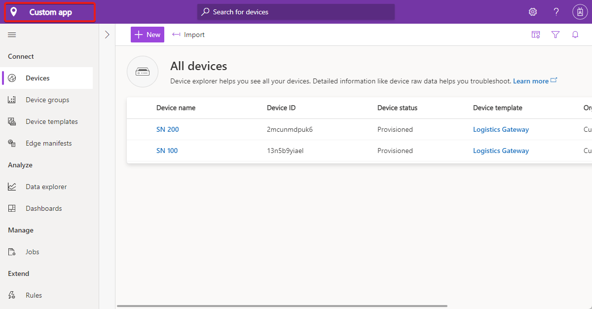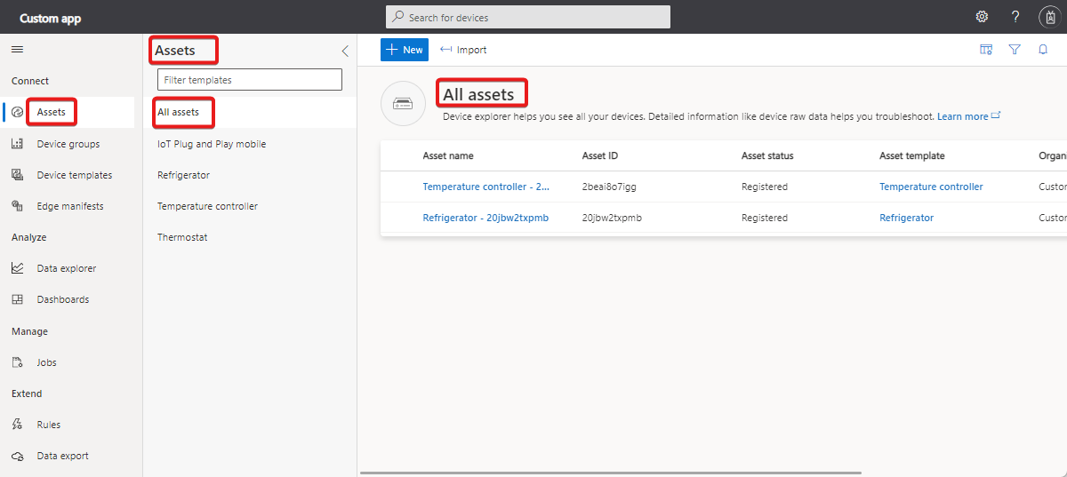 devicewithasset, open the file in a text editor and edit the value strings as shown in the following example:{ "Device": { "AllEntities": "All assets", "Approve": { "Confirmation": "Are you sure you want to approve this asset?", "Confirmation_plural": "Are you sure you want to approve these assets?" }, "Block": { "Confirmation": "Are you sure you want to block this asset?", "Confirmation_plural": "Are you sure you want to block these assets?" }, "ConnectionStatus": { "Connected": "Connected", "ConnectedAt": "Connected {{lastReportedTime}}", "Disconnected": "Disconnected", "DisconnectedAt": "Disconnected {{lastReportedTime}}" }, "Create": { "Description": "Create a new asset with the given settings", "ID_HelpText": "Enter a unique identifier this asset will use to connect.", "Instructions": "To create a new asset, select an asset template, a name, and a unique ID. <1>Learn more <1></1></1>", "Name_HelpText": "Enter a user friendly name for this asset. If not specified, this will be the same as the asset ID.", "Simulated_Label": "Simulate this asset?", "Simulated_HelpText": "A simulated asset generates telemetry that enables you to test the behavior of your application before you connect a real asset.", "Title": "Create a new asset", "Unassigned_HelpText": "Choosing this will not assign the new asset to any asset template.", "HardwareId_Label": "Hardware type", "HardwareId_HelpText": "Optionally specify the manufacturer of the asset", "MiddlewareId_Label": "Connectivity solution", "MiddlewareId_HelpText": "Optionally choose what type of connectivity solution is installed on the asset" }, "Delete": { "Confirmation": "Are you sure you want to delete this asset?", "Confirmation_plural": "Are you sure you want to delete these assets?", "Title": "Delete asset permanently?", "Title_plural": "Delete assets permanently?" }, "Entity": "Asset", "Entity_plural": "Assets", "Import": { "Title": "Import assets from a file", "HelpText": "Choose the organization that can access the assets you’re importing, and then choose the file you’ll use to import. <1>Learn more <1></1></1>", "Action": "Import assets with an org assignment from a chosen file.", "Upload_Action": "Upload a .csv file", "Browse_HelpText": "You’ll use a CSV file to import assets. Click “Learn more” for samples and formatting guidelines." }, "JoinToGateway": "Attach to gateway", "List": { "Description": "Grid displaying list of assets", "Empty": { "Text": "Assets will send data to IoT Central for you to monitor, store, and analyze. <1>Learn more <1></1></1>", "Title": "Create an Asset" } }, "Migrate": { "Confirmation": "Migrating selected asset to another template. Select migration target.", "Confirmation_plural": "Migrating selected assets to another template. Select migration target." }, "Properties": { "Definition": "Asset template", "DefinitionId": "Asset template ID", "Id": "Asset ID", "Name": "Asset name", "Scope": "Organization", "Simulated": "Simulated", "Status": "Asset status" }, "Rename": "Rename asset", "Status": { "Blocked": "Blocked", "Provisioned": "Provisioned", "Registered": "Registered", "Unassociated": "Unassociated", "WaitingForApproval": "Waiting for approval" }, "SystemAreas": { "Downstreamassets": "Downstream assets", "Module_plural": "Modules", "Properties": "Properties", "RawData": "Raw data" }, "TemplateList": { "Empty": "No definitions found.", "FilterInstructions": "Filter templates" }, "Unassigned": "Unassigned", "Unblock": { "Confirmation": "Are you sure you want to unblock this asset?", "Confirmation_plural": "Are you sure you want to unblock these assets?" } } }Upload your edited customization file and select Save to see your new text in the application: