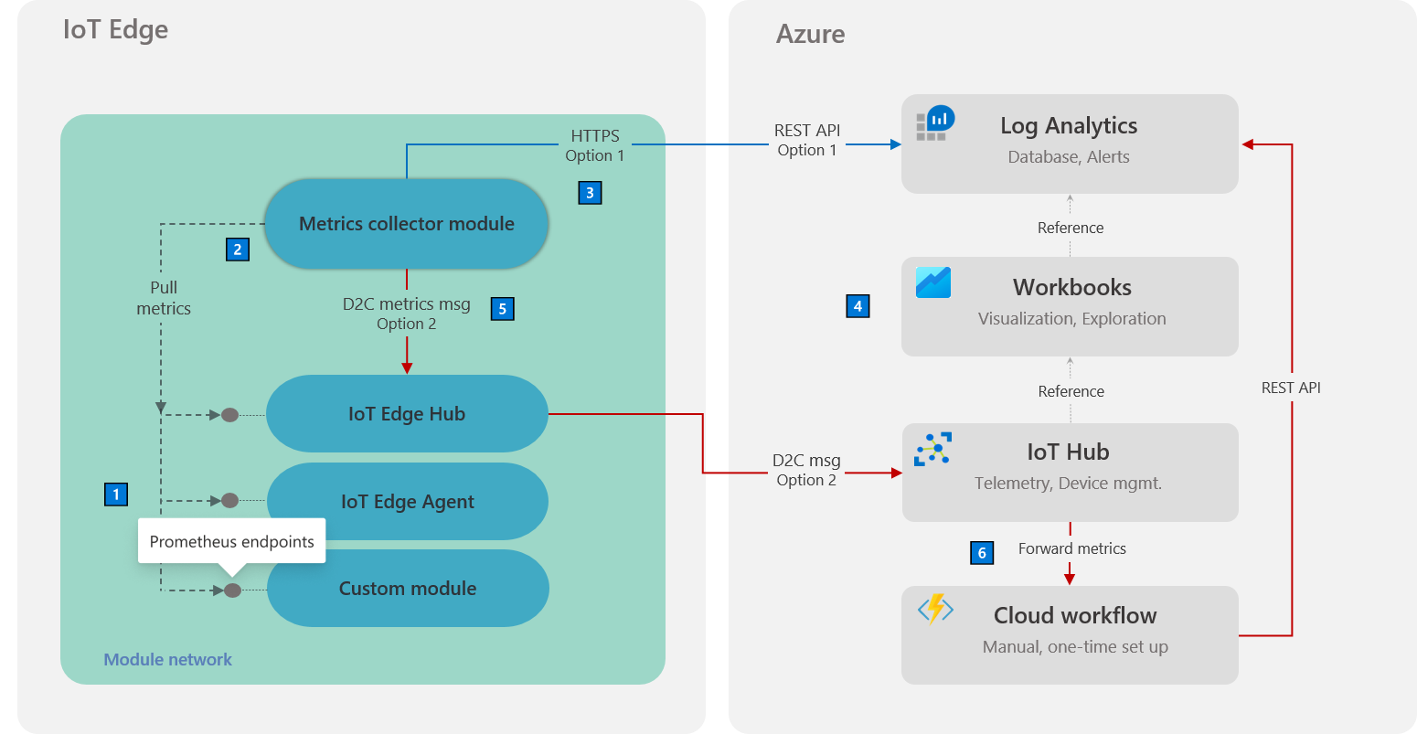 1 Currently, using option 1 to directly transport metrics to Log Analytics from the IoT Edge device is the simpler path that requires minimal setup. The first option is preferred unless your specific scenario demands the option 2 approach so that the IoT Edge device communicates only with IoT Hub.