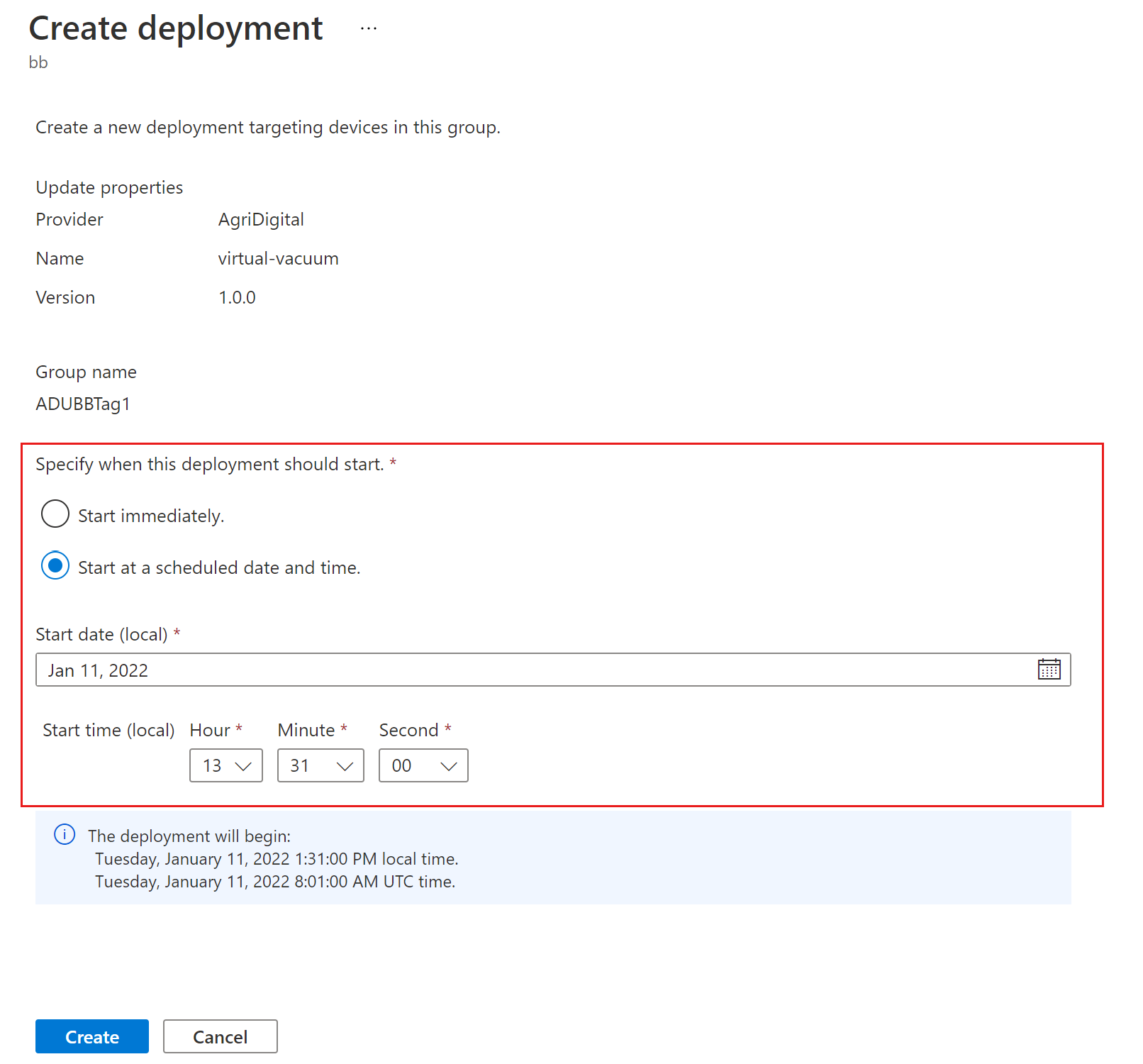 On the Create deployment page, schedule your deployment to start immediately or in the future, and then select Create.
