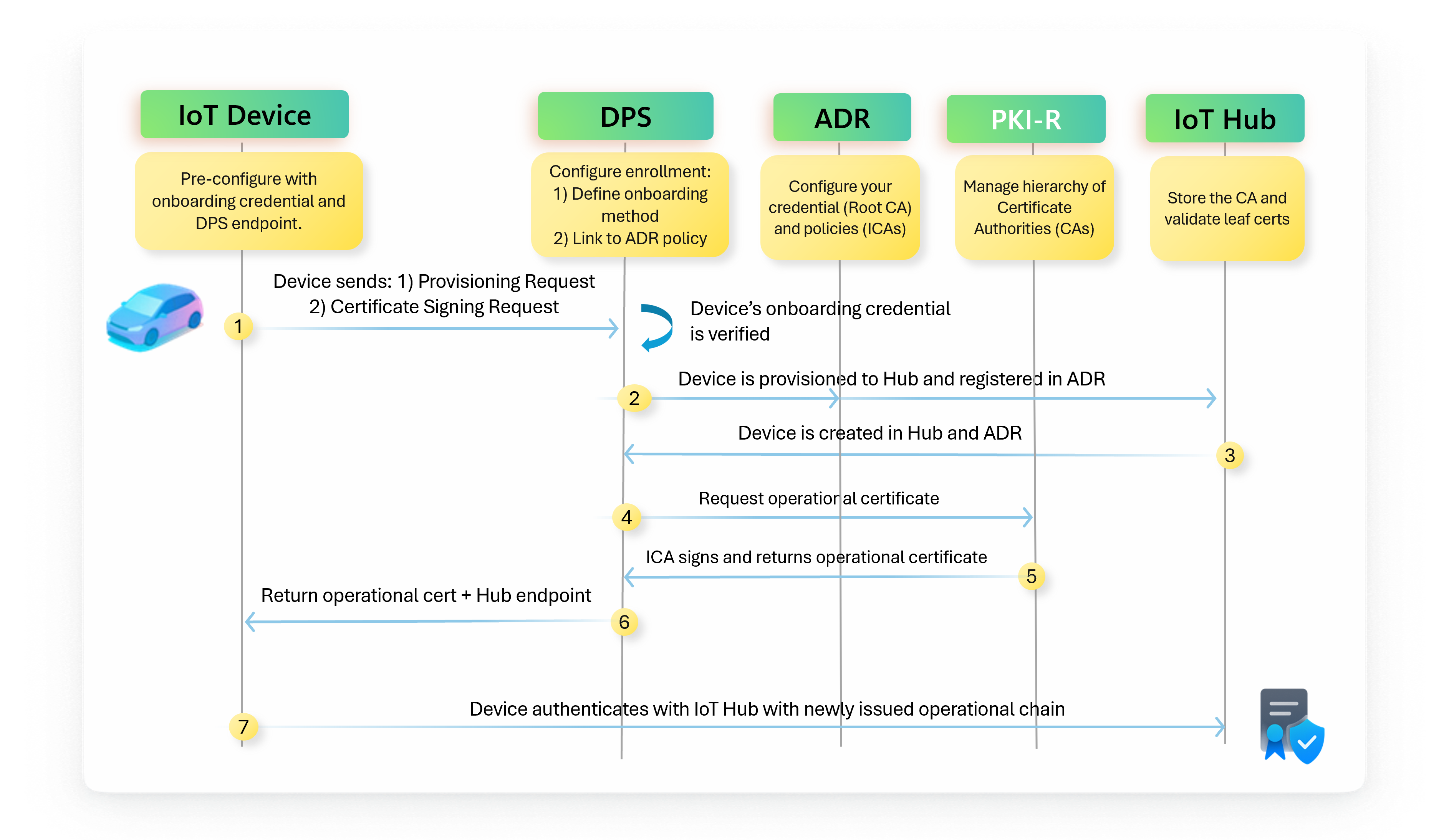 The following diagram illustrates the end-to-end process of device provisioning with certificate management: