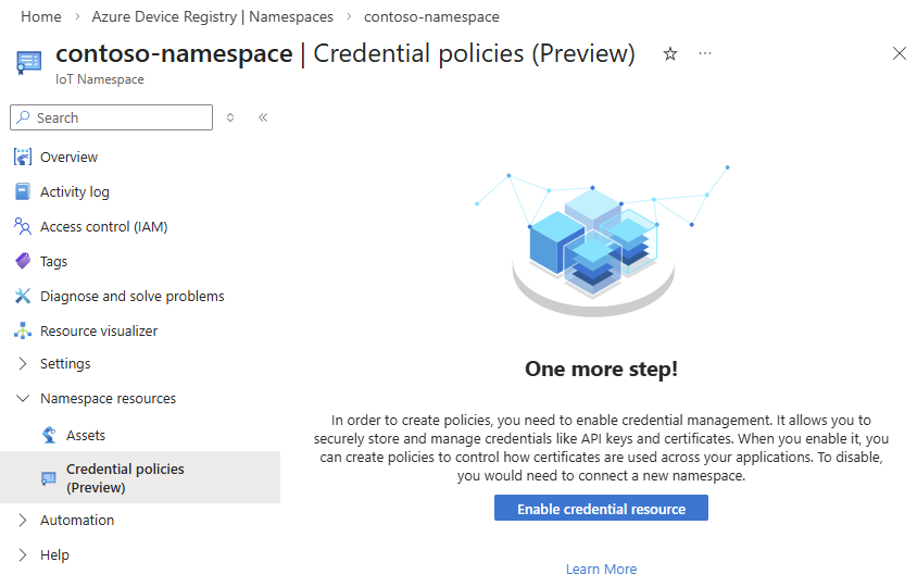 When you create a namespace with a system-assigned managed identity, the process also creates a credential known as root CA and a default policy known as intermediate CA. Certificate management uses these credentials and policies to onboard devices to the namespace.