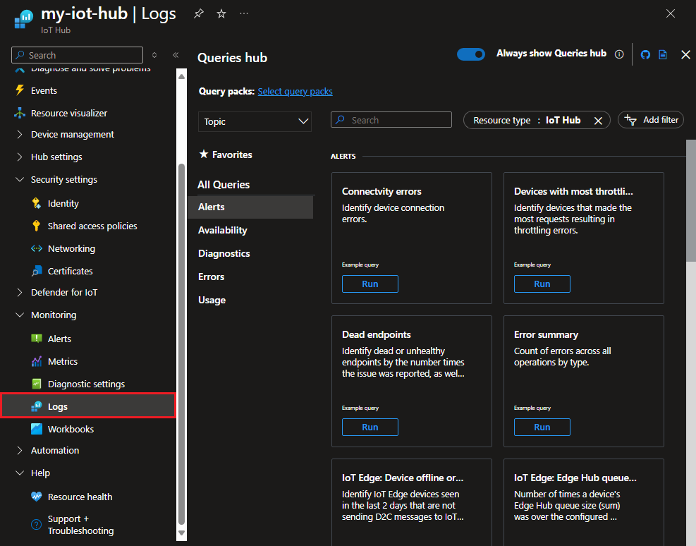 To perform Log Analytics, go to the Azure portal and open your IoT hub, then select Logs under Monitoring. These Log Analytics queries are scoped, by default, to the logs and metrics collected in Azure Monitor Logs for your IoT hub.