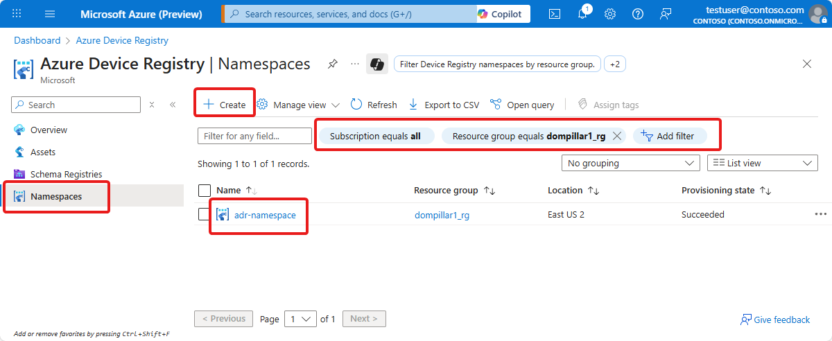 4. Use the Namespaces page to view the namespaces in Azure Device Registry. By default, the Namespaces page shows the namespaces in your subscription. Use the filters to view a subset of the namespaces, such as the namespaces in a specific resource group. From this page, you can create new namespaces, or view the details of existing namespaces: