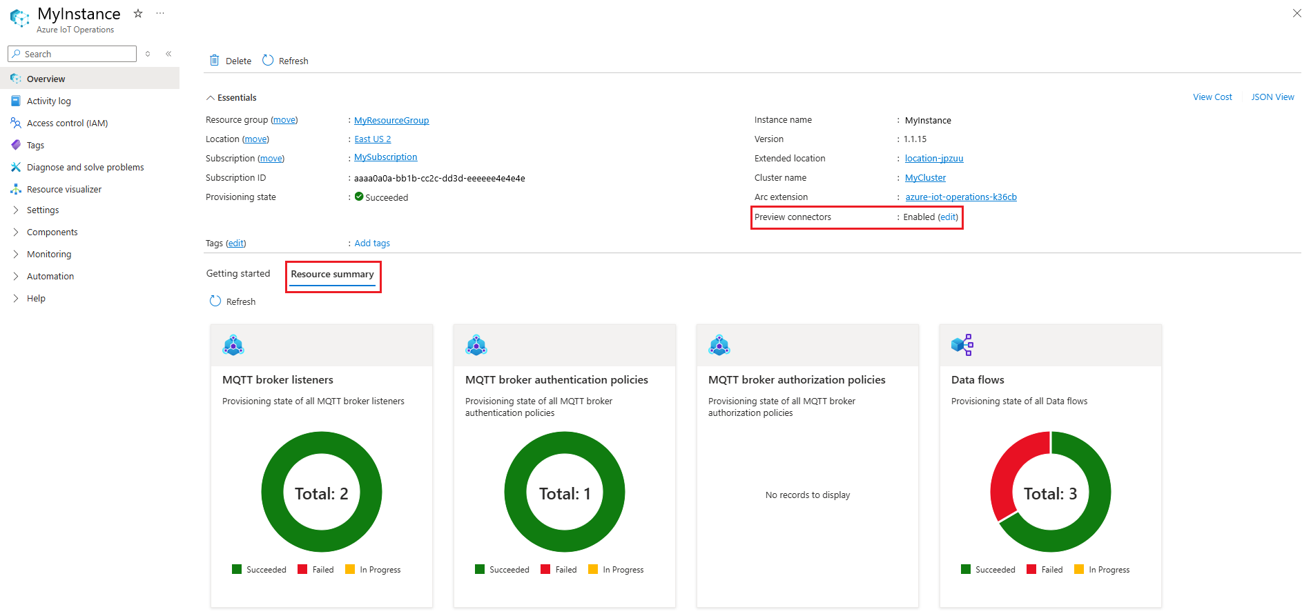 Each Azure IoT Operations instance includes several components, like the MQTT broker, connector for OPC UA, and data flows. To learn more about managing these components, see their respective articles. For example, to manage the MQTT broker, start with Broker overview.