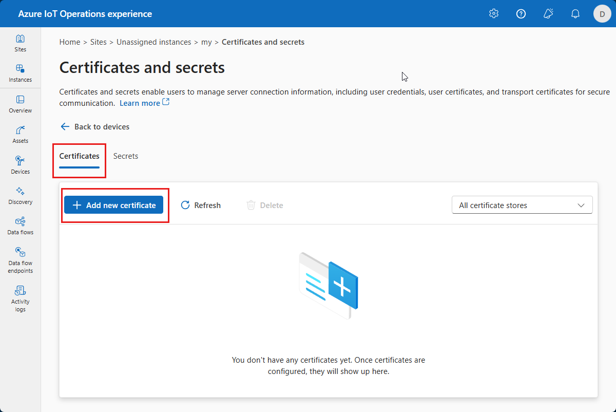 On the Certificates and secrets page, select Add new certificate: