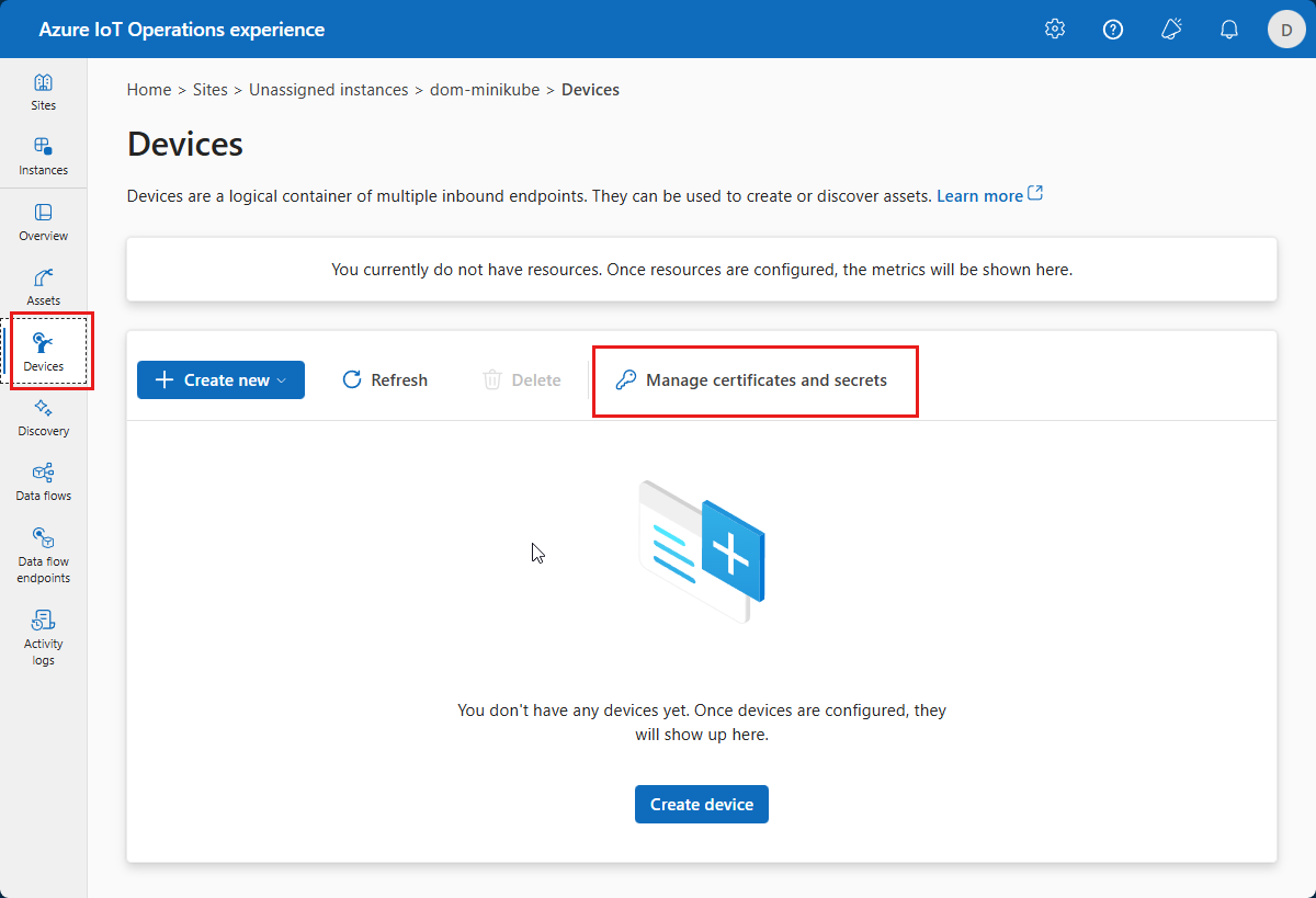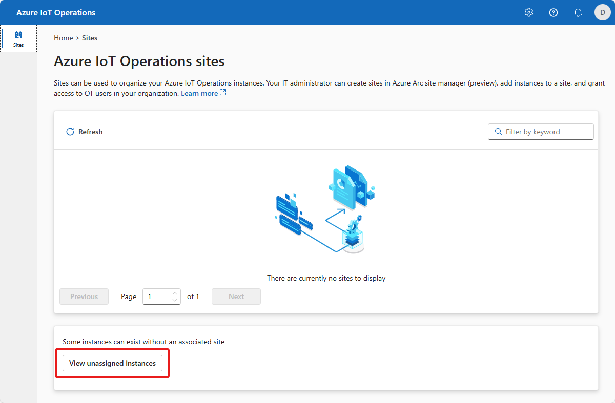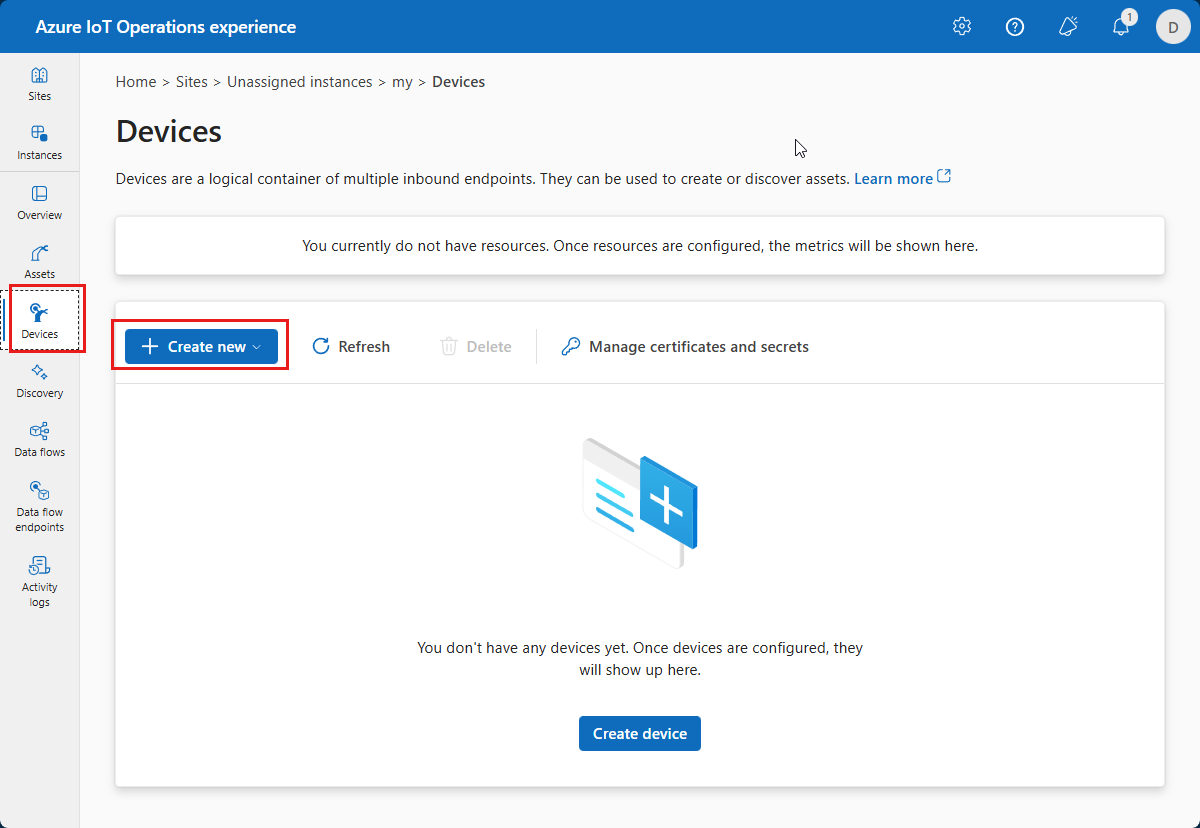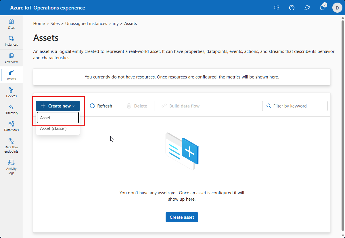 After you select your instance in operations experience, you see the available list of assets on the Assets page. If there are no assets yet, this list is empty: