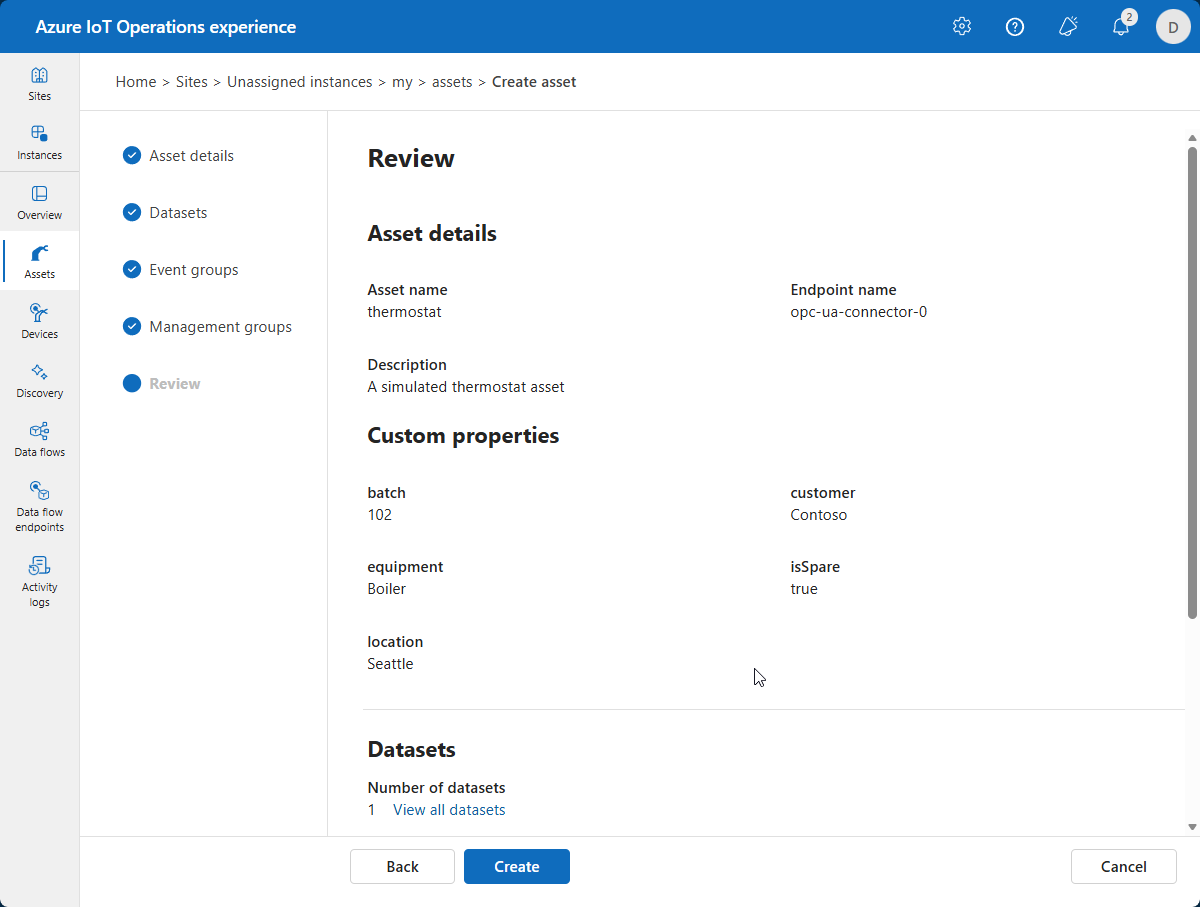 Review your asset and tag details and make any adjustments you need before you select Create: