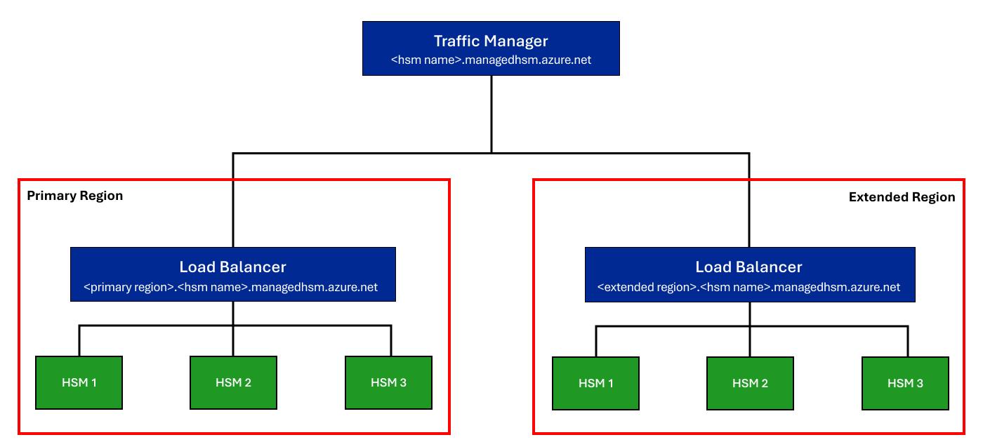 When multi-region replication is enabled on a managed HSM, a second managed HSM pool, with three load-balanced HSM partitions, is created in an extended region. When requests are issued to the Traffic Manager global DNS endpoint <hsm-name>.managedhsm.azure.net, the closest available region receives and fulfills the request. While each region individually maintains regional high-availability due to the distribution of HSMs across the region, the traffic manager ensures that even if all partitions of a managed HSM in one region are unavailable due to a catastrophe, requests are still served by the managed HSM pool in the extended region.