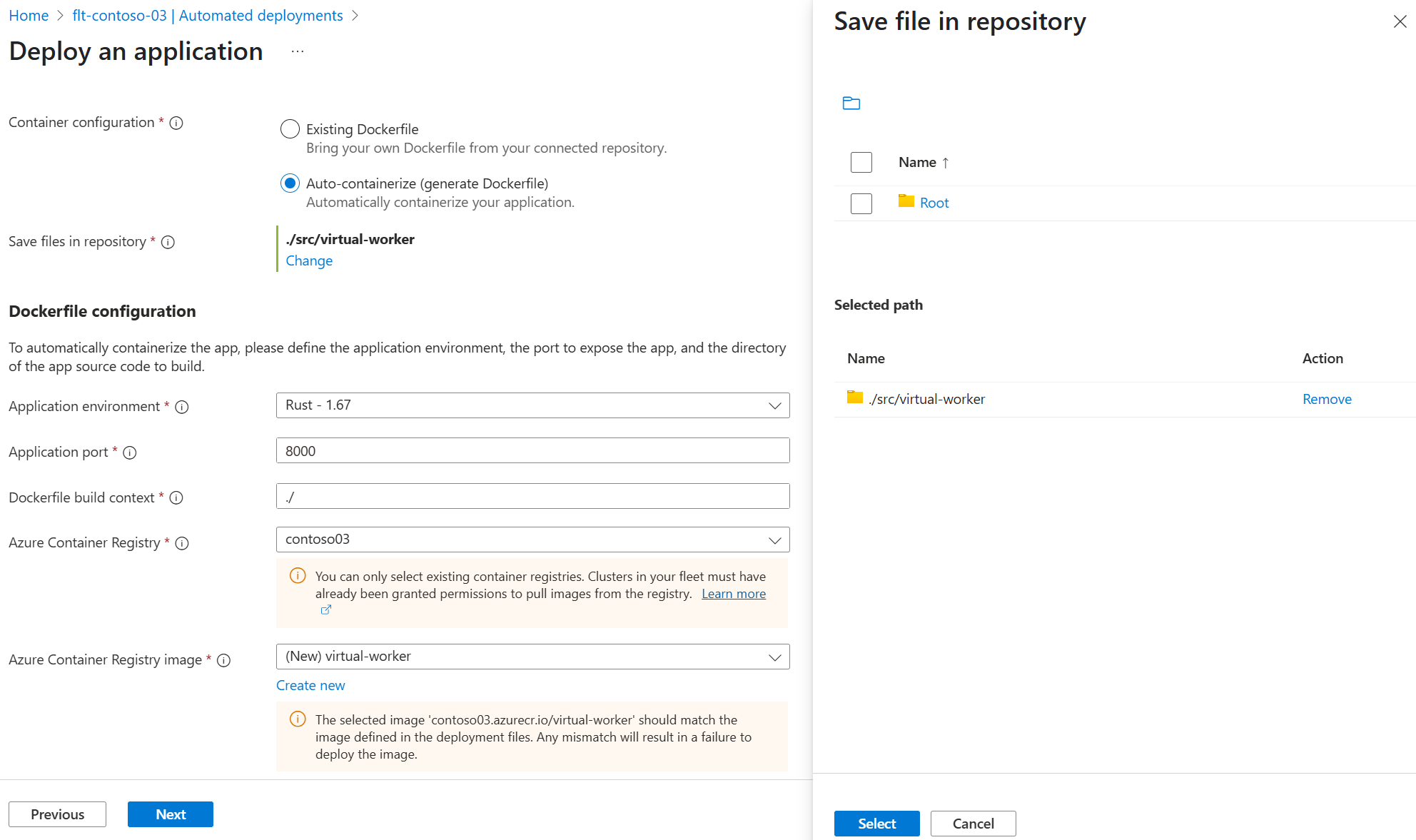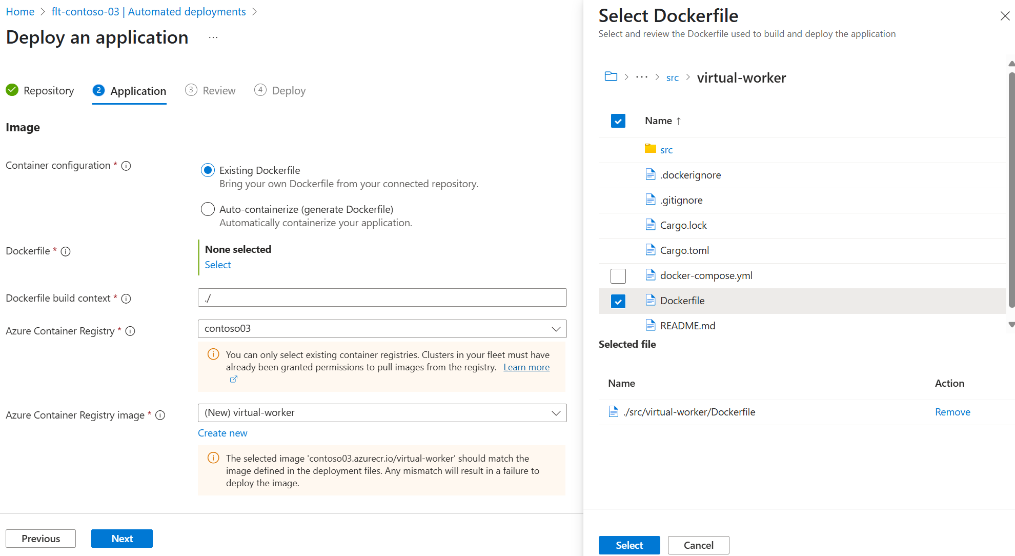 .dockerignorefile. - Select an existing Azure Container Registry. This registry is used to store the built application image. Any AKS cluster that can receive the application must be given