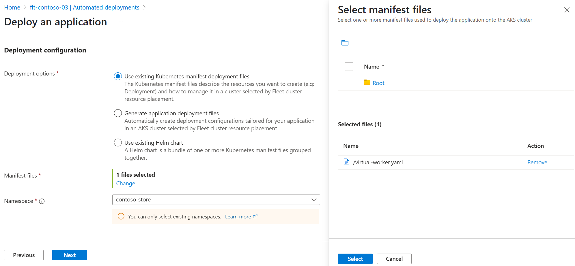 - Select Use existing Kubernetes manifest deployment files for the deployment options.