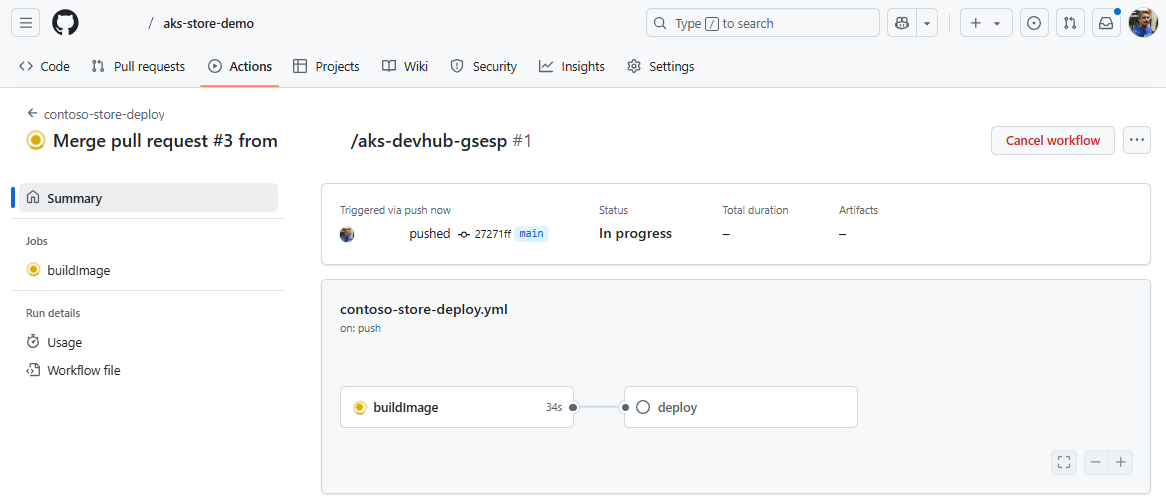 Merging the change runs the GitHub Actions workflow that builds your application into a container image and stores it in the selected Azure Container Registry.
